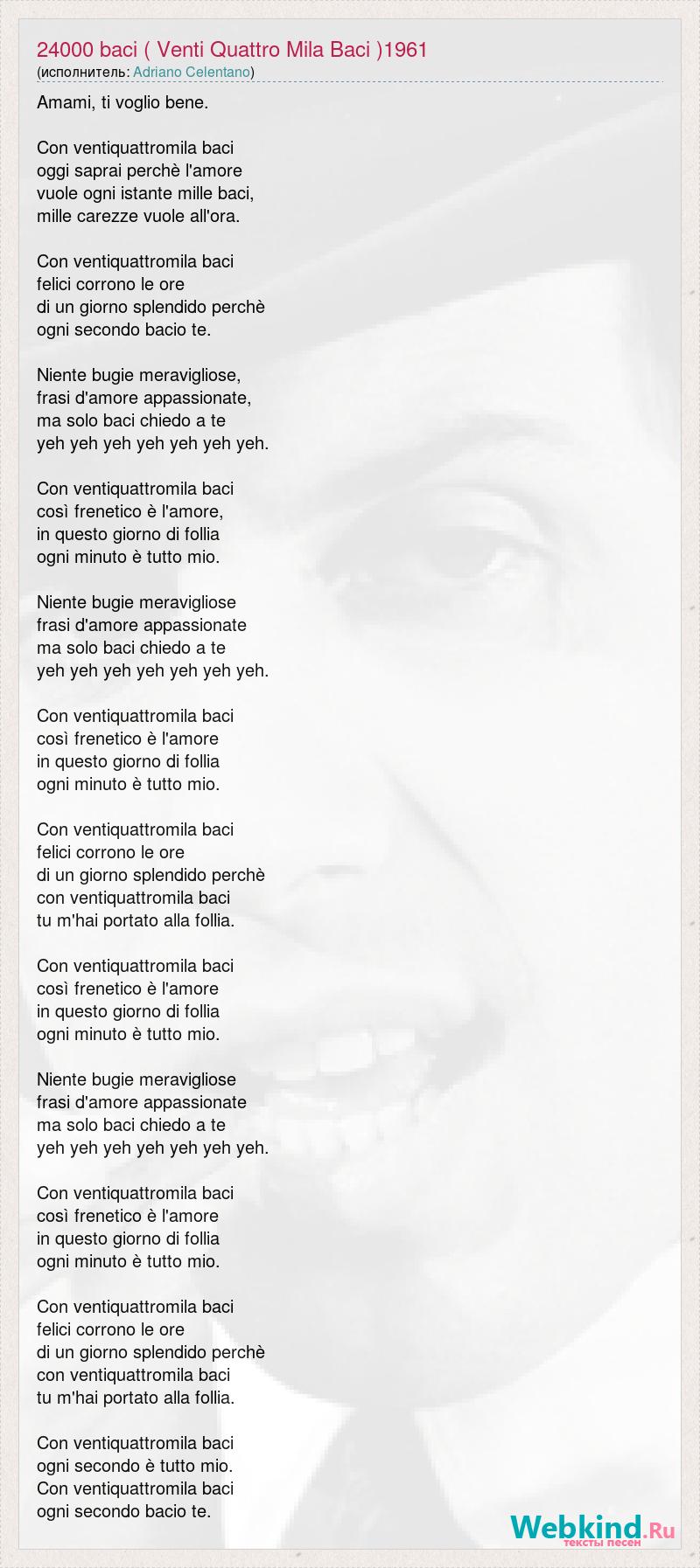 Amami, ti voglio bene. Con ventiquattromila baci oggi saprai perchè l'amore vuole ogni istante mille baci, mille carezze vuole all'ora. Con ventiquattromila baci felici corrono le ore di un giorno splendido perchè ogni secondo bacio te. Niente bugie meravigliose, frasi d'amore appassionate, ma solo baci chiedo a te yeh yeh yeh yeh yeh yeh yeh. Con ventiquattromila baci così frenetico è l'amore, in questo giorno di follia ogni minuto è tutto mio. Niente bugie meravigliose frasi d'amore appassionate ma solo baci chiedo a te yeh yeh yeh yeh yeh yeh yeh. Con ventiquattromila baci così frenetico è l'amore in questo giorno di follia ogni minuto è tutto mio. Con ventiquattromila baci felici corrono le ore di un giorno splendido perchè con ventiquattromila baci tu m'hai portato alla follia. Con ventiquattromila baci così frenetico è l'amore in questo giorno di follia ogni minuto è tutto mio. Niente bugie meravigliose frasi d'amore appassionate ma solo baci chiedo a te yeh yeh yeh yeh yeh yeh yeh. Con ventiquattromila baci così frenetico è l'amore in questo giorno di follia ogni minuto è tutto mio. Con ventiquattromila baci felici corrono le ore di un giorno splendido perchè con ventiquattromila baci tu m'hai portato alla follia. Con ventiquattromila baci ogni secondo è tutto mio. Con ventiquattromila baci ogni secondo bacio te.