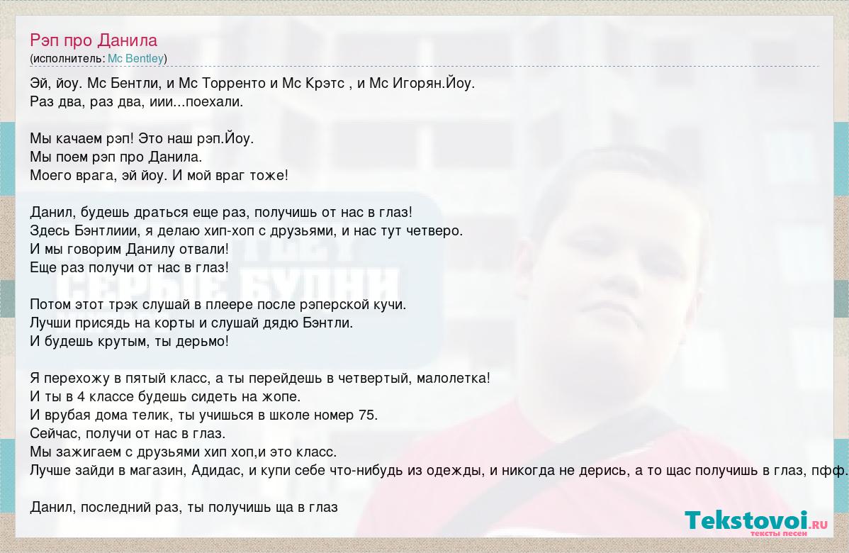 Эй, йоу. Мс Бентли, и Мс Торренто и Мс Крэтс , и Мс Игорян.Йоу. Раз два, раз два, иии...поехали. Мы качаем рэп! Это наш рэп.Йоу. Мы поем рэп про Данила. Моего врага, эй йоу. И мой враг тоже! Данил, будешь драться еще раз, получишь от нас в глаз! Здесь Бэнтлиии, я делаю хип-хоп с друзьями, и нас тут четверо. И мы говорим Данилу отвали! Еще раз получи от нас в глаз! Потом этот трэк слушай в плеере после рэперской кучи. Лучши присядь на корты и слушай дядю Бэнтли. И будешь крутым, ты дерьмо! Я перехожу в пятый класс, а ты перейдешь в четвертый, малолетка! И ты в 4 классе будешь сидеть на жопе. И врубая дома телик, ты учишься в школе номер 75. Сейчас, получи от нас в глаз. Мы зажигаем с друзьями хип хоп,и это класс. Лучше зайди в магазин, Адидас, и купи себе что-нибудь из одежды, и никогда не дерись, а то щас получишь в глаз, пфф. Данил, последний раз, ты получишь ща в глаз