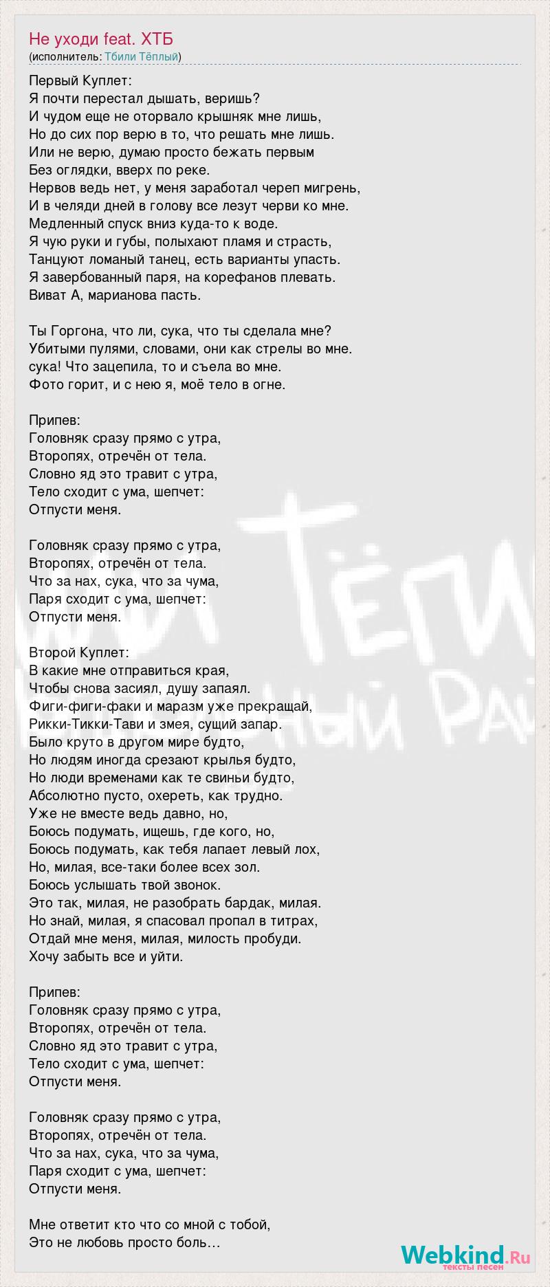Первый Куплет: Я почти перестал дышать, веришь? И чудом еще не оторвало крышняк мне лишь, Но до сих пор верю в то, что решать мне лишь. Или не верю, думаю просто бежать первым Без оглядки, вверх по реке. Нервов ведь нет, у меня заработал череп мигрень, И в челяди дней в голову все лезут черви ко мне. Медленный спуск вниз куда-то к воде. Я чую руки и губы, полыхают пламя и страсть, Танцуют ломаный танец, есть варианты упасть. Я завербованный паря, на корефанов плевать. Виват А, марианова пасть. Ты Горгона, что ли, сука, что ты сделала мне? Убитыми пулями, словами, они как стрелы во мне. сука! Что зацепила, то и съела во мне. Фото горит, и с нею я, моё тело в огне. Припев: Головняк сразу прямо с утра, Второпях, отречён от тела. Словно яд это травит с утра, Тело сходит с ума, шепчет: Отпусти меня. Головняк сразу прямо с утра, Второпях, отречён от тела. Что за нах, сука, что за чума, Паря сходит с ума, шепчет: Отпусти меня. Второй Куплет: В какие мне отправиться края, Чтобы снова засиял, душу запаял. Фиги-фиги-факи и маразм уже прекращай, Рикки-Тикки-Тави и змея, сущий запар. Было круто в другом мире будто, Но людям иногда срезают крылья будто, Но люди временами как те свиньи будто, Абсолютно пусто, охереть, как трудно. Уже не вместе ведь давно, но, Боюсь подумать, ищешь, где кого, но, Боюсь подумать, как тебя лапает левый лох, Но, милая, все-таки более всех зол. Боюсь услышать твой звонок. Это так, милая, не разобрать бардак, милая. Но знай, милая, я спасовал пропал в титрах, Отдай мне меня, милая, милость пробуди. Хочу забыть все и уйти. Припев: Головняк сразу прямо с утра, Второпях, отречён от тела. Словно яд это травит с утра, Тело сходит с ума, шепчет: Отпусти меня. Головняк сразу прямо с утра, Второпях, отречён от тела. Что за нах, сука, что за чума, Паря сходит с ума, шепчет: Отпусти меня. Мне ответит кто что со мной с тобой, Это не любовь просто боль…