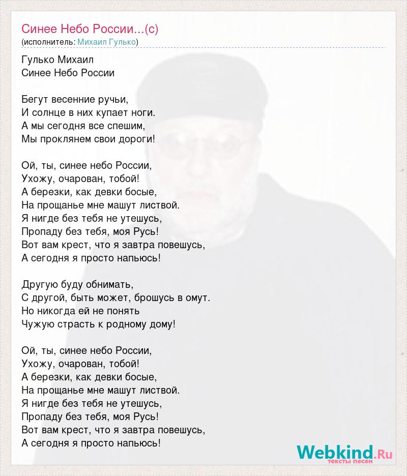 Гулько Михаил Синее Небо России Бегут весенние ручьи, И солнце в них купает ноги. А мы сегодня все спешим, Мы проклянем свои дороги! Ой, ты, синее небо России, Ухожу, очарован, тобой! А березки, как девки босые, На прощанье мне машут листвой. Я нигде без тебя не утешусь, Пропаду без тебя, моя Русь! Вот вам крест, что я завтра повешусь, А сегодня я просто напьюсь! Другую буду обнимать, С другой, быть может, брошусь в омут. Но никогда ей не понять Чужую страсть к родному дому! Ой, ты, синее небо России, Ухожу, очарован, тобой! А березки, как девки босые, На прощанье мне машут листвой. Я нигде без тебя не утешусь, Пропаду без тебя, моя Русь! Вот вам крест, что я завтра повешусь, А сегодня я просто напьюсь!