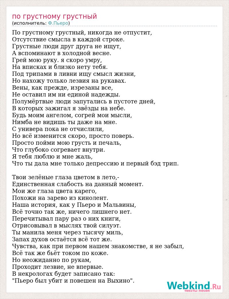 По грустному грустный, никогда не отпустит, Отсутствие смысла в каждой строке. Грустные люди друг друга не ищут, А вспоминают в холодной весне. Грей мою руку. я скоро умру, На вписках и близко нету тебя. Под трипами в ливни ищу смысл жизни, Но нахожу только лезвия на рукавах. Вены, как прежде, изрезаны все, Не оставил им ни единой надежды. Полумёртвые люди запутались в пустоте дней, В которых зажигал я звёзды на небе. Будь моим ангелом, согрей мои мысли, Нимба не видишь ты даже на мне. С универа пока не отчислили, Но всё изменится скоро, просто поверь. Просто пойми мою грусть и печаль, Что глубоко согревает внутри. Я тебя люблю и мне жаль, Что ты дала мне только депрессию и первый бэд трип. Твои зелёные глаза цветом в лето,- Единственная слабость на данный момент. Мои же глаза цвета карего, Похожи на зарево из кинолент. Наша история, как у Пьеро и Мальвины, Всё точно так же, ничего лишнего нет. Перечитывал пару раз о них книги, Отрисовывал в мыслях твой силуэт. Ты манила меня через тысячу миль, Запах духов остаётся всё тот же. Чувства, как при первом нашем знакомстве, я не забыл, Всё так же бьёт током по коже. Но неожиданно по рукам, Проходит лезвие, не впервые. В некрологах будет записано так: "Пьеро был убит и повешен на Выхино".