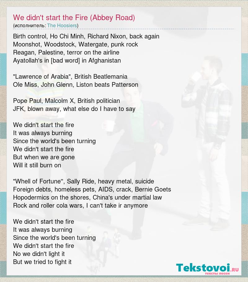 Birth control, Ho Chi Minh, Richard Nixon, back again Moonshot, Woodstock, Watergate, punk rock Reagan, Palestine, terror on the airline Ayatollah's in [bad word] in Afghanistan "Lawrence of Arabia", British Beatlemania Ole Miss, John Glenn, Liston beats Patterson Pope Paul, Malcolm X, British politician JFK, blown away, what else do I have to say We didn't start the fire It was always burning Since the world's been turning We didn't start the fire But when we are gone Will it still burn on "Whell of Fortune'', Sally Ride, heavy metal, suicide Foreign debts, homeless pets, AIDS, crack, Bernie Goets Hopodermics on the shores, China's under martial law Rock and roller cola wars, I can't take ir anymore We didn't start the fire It was always burning Since the world's been turning We didn't start the fire No we didn't light it But we tried to fight it