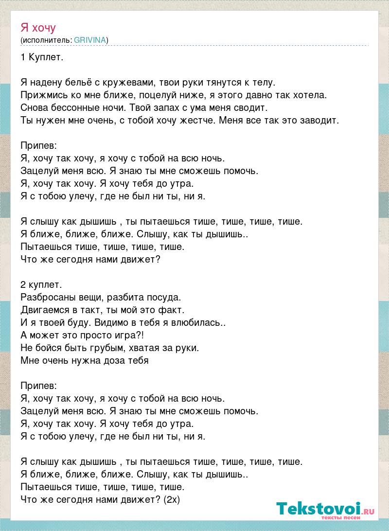 1 Куплет. Я надену бельё с кружевами, твои руки тянутся к телу. Прижмись ко мне ближе, поцелуй ниже, я этого давно так хотела. Снова бессонные ночи. Твой запах с ума меня сводит. Ты нужен мне очень, с тобой хочу жестче. Меня все так это заводит. Припев: Я, хочу так хочу, я хочу с тобой на всю ночь. Зацелуй меня всю. Я знаю ты мне сможешь помочь. Я, хочу так хочу. Я хочу тебя до утра. Я с тобою улечу, где не был ни ты, ни я. Я слышу как дышишь , ты пытаешься тише, тише, тише, тише. Я ближе, ближе, ближе. Слышу, как ты дышишь.. Пытаешься тише, тише, тише, тише. Что же сегодня нами движет? 2 куплет. Разбросаны вещи, разбита посуда. Двигаемся в такт, ты мой это факт. И я твоей буду. Видимо в тебя я влюбилась.. А может это просто игра?! Не бойся быть грубым, хватая за руки. Мне очень нужна доза тебя Припев: Я, хочу так хочу, я хочу с тобой на всю ночь. Зацелуй меня всю. Я знаю ты мне сможешь помочь. Я, хочу так хочу. Я хочу тебя до утра. Я с тобою улечу, где не был ни ты, ни я. Я слышу как дышишь , ты пытаешься тише, тише, тише, тише. Я ближе, ближе, ближе. Слышу, как ты дышишь.. Пытаешься тише, тише, тише, тише. Что же сегодня нами движет? (2х)