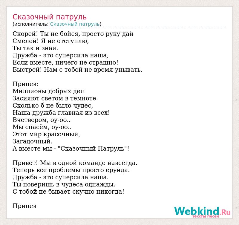 Скорей! Ты не бойся, просто руку дай Смелей! Я не отступлю, Ты так и знай. Дружба - это суперсила наша, Если вместе, ничего не страшно! Быстрей! Нам с тобой не время унывать. Припев: Миллионы добрых дел Засияют светом в темноте Сколько б не было чудес, Наша дружба главная из всех! Вчетвером, оу-оо.. Мы спасём, оу-оо.. Этот мир красочный, Загадочный. А вместе мы - "Сказочный Патруль"! Привет! Мы в одной команде навсегда. Теперь все проблемы просто ерунда. Дружба - это суперсила наша. Ты поверишь в чудеса однажды. С тобой не бывает скучно никогда! Припев