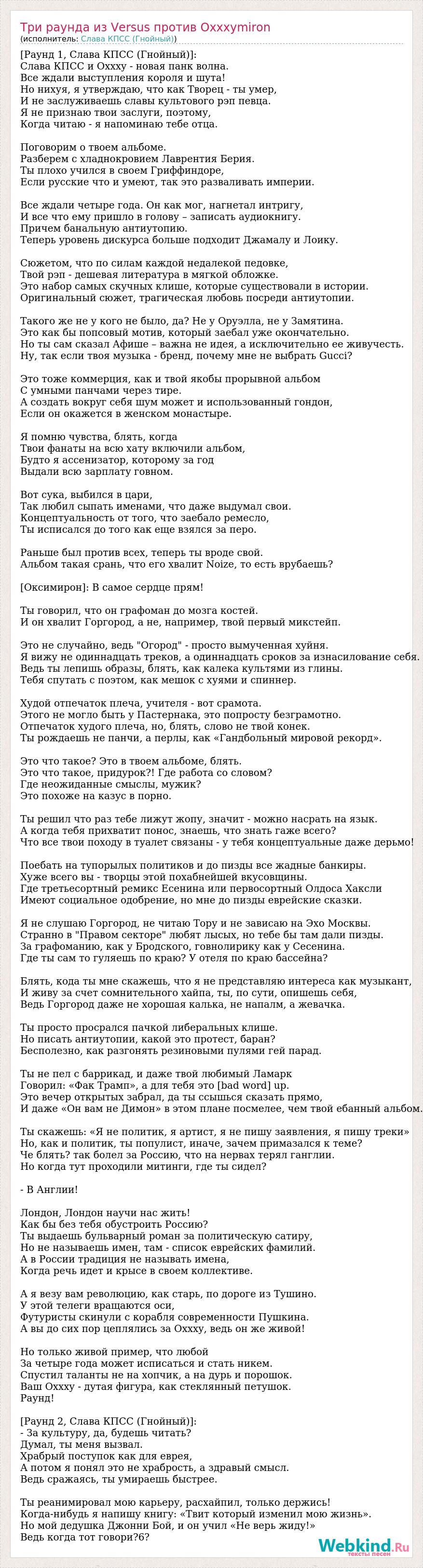 [Раунд 1, Слава КПСС (Гнойный)]: Слава КПСС и Oxxxy - новая панк волна. Все ждали выступления короля и шута! Но нихуя, я утверждаю, что как Творец - ты умер, И не заслуживаешь славы культового рэп певца. Я не признаю твои заслуги, поэтому, Когда читаю - я напоминаю тебе отца. Поговорим о твоем альбоме. Разберем с хладнокровием Лаврентия Берия. Ты плохо учился в своем Гриффиндоре, Если русские что и умеют, так это разваливать империи. Все ждали четыре года. Он как мог, нагнетал интригу, И все что ему пришло в голову – записать аудиокнигу. Причем банальную антиутопию. Теперь уровень дискурса больше подходит Джамалу и Лоику. Сюжетом, что по силам каждой недалекой педовке, Твой рэп - дешевая литература в мягкой обложке. Это набор самых скучных клише, которые существовали в истории. Оригинальный сюжет, трагическая любовь посреди антиутопии. Такого же не у кого не было, да? Не у Оруэлла, не у Замятина. Это как бы попсовый мотив, который заебал уже окончательно. Но ты сам сказал Афише – важна не идея, а исключительно ее живучесть. Ну, так если твоя музыка - бренд, почему мне не выбрать Gucci? Это тоже коммерция, как и твой якобы прорывной альбом С умными панчами через тире. А создать вокруг себя шум может и использованный гондон, Если он окажется в женском монастыре. Я помню чувства, блять, когда Твои фанаты на всю хату включили альбом, Будто я ассенизатор, которому за год Выдали всю зарплату говном. Вот сука, выбился в цари, Так любил сыпать именами, что даже выдумал свои. Концептуальность от того, что заебало ремесло, Ты исписался до того как еще взялся за перо. Раньше был против всех, теперь ты вроде свой. Альбом такая срань, что его хвалит Noize, то есть врубаешь? [Оксимирон]: В самое сердце прям! Ты говорил, что он графоман до мозга костей. И он хвалит Горгород, а не, например, твой первый микстейп. Это не случайно, ведь "Огород" - просто вымученная хуйня. Я вижу не одиннадцать треков, а одиннадцать сроков за изнасилование себя. Ведь ты лепишь образы, блять, как калека культями из глины. Тебя спутать с поэтом, как мешок с хуями и спиннер. Худой отпечаток плеча, учителя - вот срамота. Этого не могло быть у Пастернака, это попросту безграмотно. Отпечаток худого плеча, но, блять, слово не твой конек. Ты рождаешь не панчи, а перлы, как «Гандбольный мировой рекорд». Это что такое? Это в твоем альбоме, блять. Это что такое, придурок?! Где работа со словом? Где неожиданные смыслы, мужик? Это похоже на казус в порно. Ты решил что раз тебе лижут жопу, значит - можно насрать на язык. А когда тебя прихватит понос, знаешь, что знать гаже всего? Что все твои походу в туалет связаны - у тебя концептуальные даже дерьмо! Поебать на тупорылых политиков и до пизды все жадные банкиры. Хуже всего вы - творцы этой похабнейшей вкусовщины. Где третьесортный ремикс Есенина или первосортный Олдоса Хаксли Имеют социальное одобрение, но мне до пизды еврейские сказки. Я не слушаю Горгород, не читаю Тору и не зависаю на Эхо Москвы. Странно в "Правом секторе" любят лысых, но тебе бы там дали пизды. За графоманию, как у Бродского, говнолирику как у Сесенина. Где ты сам то гуляешь по краю? У отеля по краю бассейна? Блять, кода ты мне скажешь, что я не представляю интереса как музыкант, И живу за счет сомнительного хайпа, ты, по сути, опишешь себя, Ведь Горгород даже не хорошая калька, не напалм, а жевачка. Ты просто просрался пачк
