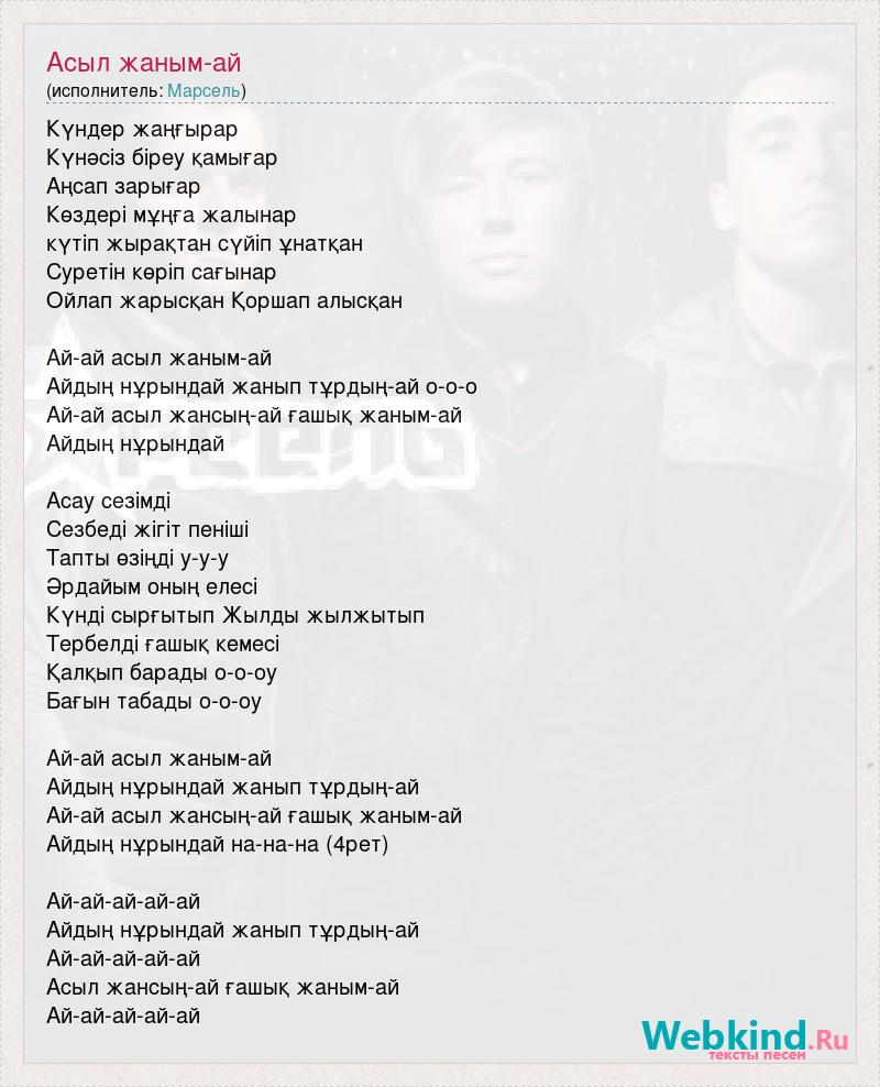 Күндер жаңғырар Күнәсіз біреу қамығар Аңсап зарығар Көздері мұңға жалынар күтіп жырақтан сүйіп ұнатқан Суретін көріп сағынар Ойлап жарысқан Қоршап алысқан Ай-ай асыл жаным-ай Айдың нұрындай жанып тұрдың-ай о-о-о Ай-ай асыл жансың-ай ғашық жаным-ай Айдың нұрындай Асау сезімді Сезбеді жігіт пеніші Тапты өзіңді у-у-у Әрдайым оның елесі Күнді сырғытып Жылды жылжытып Тербелді ғашық кемесі Қалқып барады о-о-оу Бағын табады о-о-оу Ай-ай асыл жаным-ай Айдың нұрындай жанып тұрдың-ай Ай-ай асыл жансың-ай ғашық жаным-ай Айдың нұрындай на-на-на (4рет) Ай-ай-ай-ай-ай Айдың нұрындай жанып тұрдың-ай Ай-ай-ай-ай-ай Асыл жансың-ай ғашық жаным-ай Ай-ай-ай-ай-ай
