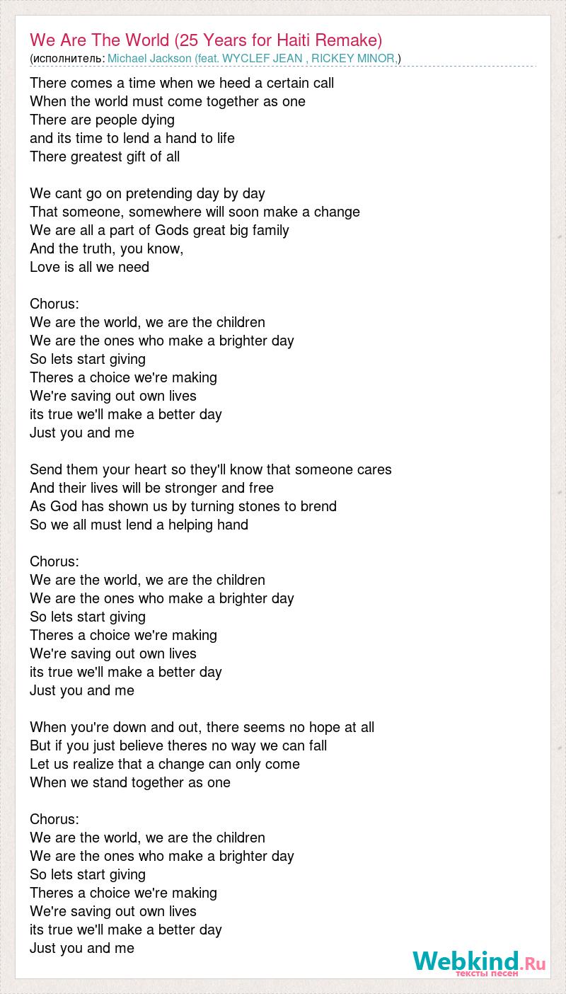 There comes a time when we heed a certain call When the world must come together as one There are people dying and its time to lend a hand to life There greatest gift of all We cant go on pretending day by day That someone, somewhere will soon make a change We are all a part of Gods great big family And the truth, you know, Love is all we need Chorus: We are the world, we are the children We are the ones who make a brighter day So lets start giving Theres a choice we're making We're saving out own lives its true we'll make a better day Just you and me Send them your heart so they'll know that someone cares And their lives will be stronger and free As God has shown us by turning stones to brend So we all must lend a helping hand Chorus: We are the world, we are the children We are the ones who make a brighter day So lets start giving Theres a choice we're making We're saving out own lives its true we'll make a better day Just you and me When you're down and out, there seems no hope at all But if you just believe theres no way we can fall Let us realize that a change can only come When we stand together as one Chorus: We are the world, we are the children We are the ones who make a brighter day So lets start giving Theres a choice we're making We're saving out own lives its true we'll make a better day Just you and me