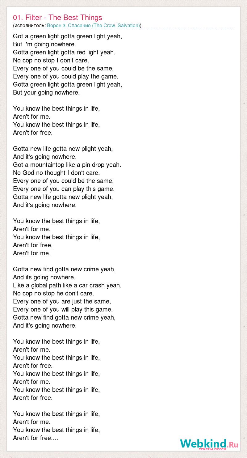 Got a green light gotta green light yeah, But I'm going nowhere. Gotta green light gotta red light yeah. No cop no stop I don't care. Every one of you could be the same, Every one of you could play the game. Gotta green light gotta green light yeah, But your going nowhere. You know the best things in life, Aren't for me. You know the best things in life, Aren't for free. Gotta new life gotta new plight yeah, And it's going nowhere. Got a mountaintop like a pin drop yeah. No God no thought I don't care. Every one of you could be the same, Every one of you can play this game. Gotta new life gotta new plight yeah, And it's going nowhere. You know the best things in life, Aren't for me. You know the best things in life, Aren't for free, Aren't for me. Gotta new find gotta new crime yeah, And its going nowhere. Like a global path like a car crash yeah, No cop no stop he don't care. Every one of you are just the same, Every one of you will play this game. Gotta new find gotta new crime yeah, And it's going nowhere. You know the best things in life, Aren't for me. You know the best things in life, Aren't for free. You know the best things in life, Aren't for me. You know the best things in life, Aren't for free. You know the best things in life, Aren't for me. You know the best things in life, Aren't for free....