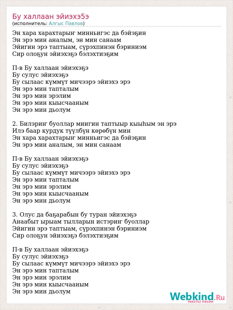 Эн хара харахтарыҥ минньигэс да бэйэҕин Эн эрэ мин аналым, эн мин санаам Эйигин эрэ таптыам, сүрэхпинэн бэриниэм Сир олоҕун эйиэхэҕэ бэлэхтиэҕим П-в Бу халлаан эйиэхэҕэ Бу сулус эйиэхэҕэ Бу сылаас күммүт мичээрэ эйиэхэ эрэ Эн эрэ мин тапталым Эн эрэ мин эрэлим Эн эрэ мин кыысчааным Эн эрэ мин дьолум 2. Билэриҥ буоллар миигин таптыыр кыыhым эн эрэ Илэ баар курдук түүлбүн көрөбүн мин Эн хара харахтарыҥ минньигэс да бэйэҕин Эн эрэ мин аналым, эн мин санаам П-в Бу халлаан эйиэхэҕэ Бу сулус эйиэхэҕэ Бу сылаас күммүт мичээрэ эйиэхэ эрэ Эн эрэ мин тапталым Эн эрэ мин эрэлим Эн эрэ мин кыысчааным Эн эрэ мин дьолум 3. Олус да баҕарабын бу туран эйиэхэҕэ Анаабыт ырыам тылларын истэриҥ буоллар Эйигин эрэ таптыам, сүрэхпинэн бэриниэм Сир олоҕун эйиэхэҕэ бэлэхтиэҕим П-в Бу халлаан эйиэхэҕэ Бу сулус эйиэхэҕэ Бу сылаас күммүт мичээрэ эйиэхэ эрэ Эн эрэ мин тапталым Эн эрэ мин эрэлим Эн эрэ мин кыысчааным Эн эрэ мин дьолум