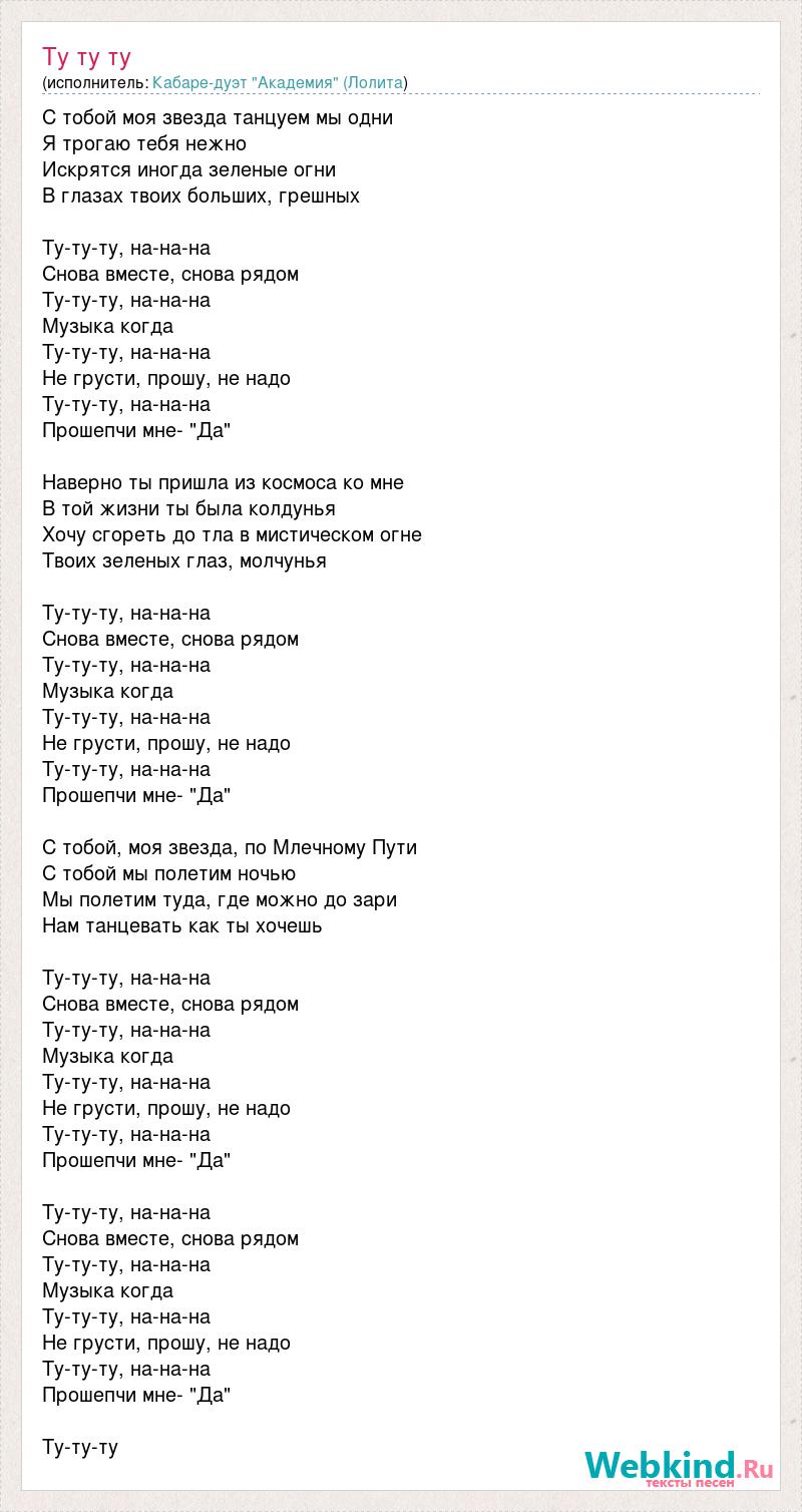 С тобой моя звезда танцуем мы одни Я трогаю тебя нежно Искрятся иногда зеленые огни В глазах твоих больших, грешных Ту-ту-ту, на-на-на Снова вместе, снова рядом Ту-ту-ту, на-на-на Музыка когда Ту-ту-ту, на-на-на Не грусти, прошу, не надо Ту-ту-ту, на-на-на Прошепчи мне- "Да" Наверно ты пришла из космоса ко мне В той жизни ты была колдунья Хочу сгореть до тла в мистическом огне Твоих зеленых глаз, молчунья Ту-ту-ту, на-на-на Снова вместе, снова рядом Ту-ту-ту, на-на-на Музыка когда Ту-ту-ту, на-на-на Не грусти, прошу, не надо Ту-ту-ту, на-на-на Прошепчи мне- "Да" С тобой, моя звезда, по Млечному Пути С тобой мы полетим ночью Мы полетим туда, где можно до зари Нам танцевать как ты хочешь Ту-ту-ту, на-на-на Снова вместе, снова рядом Ту-ту-ту, на-на-на Музыка когда Ту-ту-ту, на-на-на Не грусти, прошу, не надо Ту-ту-ту, на-на-на Прошепчи мне- "Да" Ту-ту-ту, на-на-на Снова вместе, снова рядом Ту-ту-ту, на-на-на Музыка когда Ту-ту-ту, на-на-на Не грусти, прошу, не надо Ту-ту-ту, на-на-на Прошепчи мне- "Да" Ту-ту-ту