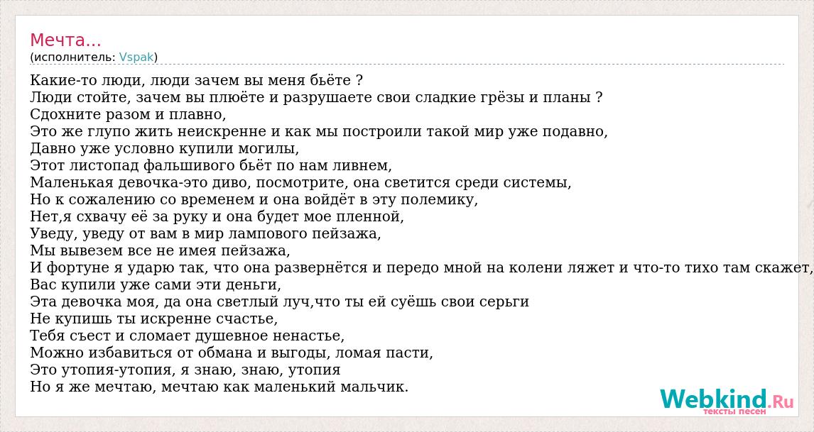 Какие-то люди, люди зачем вы меня бьёте ? Люди стойте, зачем вы плюёте и разрушаете свои сладкие грёзы и планы ? Сдохните разом и плавно, Это же глупо жить неискренне и как мы построили такой мир уже подавно, Давно уже условно купили могилы, Этот листопад фальшивого бьёт по нам ливнем, Маленькая девочка-это диво, посмотрите, она светится среди системы, Но к сожалению со временем и она войдёт в эту полемику, Нет,я схвачу её за руку и она будет мое пленной, Уведу, уведу от вам в мир лампового пейзажа, Мы вывезем все не имея пейзажа, И фортуне я ударю так, что она развернётся и передо мной на колени ляжет и что-то тихо там скажет, Вас купили уже сами эти деньги, Эта девочка моя, да она светлый луч,что ты ей суёшь свои серьги Не купишь ты искренне счастье, Тебя съест и сломает душевное ненастье, Можно избавиться от обмана и выгоды, ломая пасти, Это утопия-утопия, я знаю, знаю, утопия Но я же мечтаю, мечтаю как маленький мальчик.