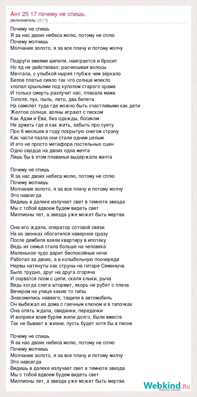 Почему не спишь Я за нас двоих небеса молю, потому не сплю Почему молчишь Молчание золото, я за все плачу и потому молчу Подруги змеями шипели, наиграется и бросит Но яд не действовал, расчесывая волосы Мечтала, с улыбкой ныряя глубже чем зеркало Белое платье сияло так что солнце млекло хлопал крыльями под куполом старого храма И только смерть разлучит нас, плакала мама Тополя, пух, пыль, лето, два билета На самолет туда где можно быть счастливыми как дети Желтое солнце, волны играют с песком Как Адам и Ева, без одежды, босиком Не думать где и как жить, забыть про суету Про 6 месяцев в году покрытую снегом страну Как части пазла они стали одним целым И это не просто метафора постельных сцен Одно сердце на двоих одна мечта Лишь бы в этом плаваньи выдержала мачта Почему не спишь Я за нас двоих небеса молю, потому не сплю Почему молчишь Молчание золото, я за все плачу и потому молчу Это навсегда Видишь в далеке излучает свет в темноте звезда Мы с тобой вдвоем будем видеть свет Миллионы лет, а звезда уже может быть мертва Она его ждала, оператор сотовой связи На их звонках обогатился наверное сразу После дембеля взяли квартиру в ипотеку Ведь их семья стала больше на человека Маленькое чудо дарит беспокойные ночи Работал за двоих, а в колыбельную поочереди Нервы натянуты как струны на гитаре Семеныча Было трудно, друг на друга сгоряча И сорватся псом с цепи, скаля клыки, рыча Ведь когда слега штормит, якорь не рубят с плеча Вечером на улице какие то типы Знакомились навяего, тащили в автомобиль Он выбежал из дома с гаечным ключом и в тапочках Она опять ждала, свиданки, передачки И вопреки всем бурям жили долго, были вместе Так не бывает в жизни, пусть будет хотя бы в песне Почему не спишь Я за нас двоих небеса молю, потому не сплю Почему молчишь Молчание золото, я за все плачу и потому молчу Это навсегда Видишь в далеке излучает свет в темноте звезда Мы с тобой вдвоем будем видеть свет Миллионы лет, а звезда уже может быть мертва