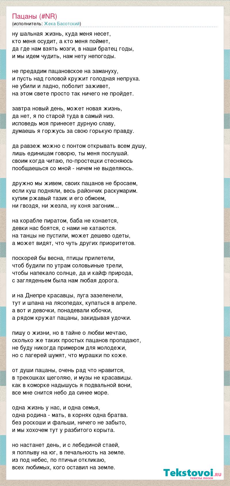 ну шальная жизнь, куда меня несет, кто меня осудит, а кто меня поймет, да где нам взять мозги, в наши братец годы, и мы идем чудить, нам нету непогоды. не предадим пацановское на замануху, и пусть над головой кружит голодная непруха. не убили и ладно, поболит заживет, на этом свете просто так ничего не пройдет. завтра новый день, может новая жизнь, да нет, я по старой туда в самый низ. исповедь моя принесет дурную славу, думаешь я горжусь за свою горькую правду. да равзеж можно с понтом открывать всем душу, лишь единицам говорю, ты меня послушай. своим когда читаю, по-простецки стесняюсь пообщаешься со мной - ничем не выделяюсь. дружно мы живем, своих пацанов не бросаем, если куш подняли, весь райончик раскумарим. купим ржавый тазик и его обмоем, ни гвоздя, ни жезла, ну коня загоним... на корабле пиратом, баба не конается, девки нас боятся, с нами не катаются. на танцы не пустили, может дешево одеты, а может видят, что чуть других приоритетов. поскорей бы весна, птицы прилетели, чтоб будили по утрам соловьиные трели, чтобы напекало солнце, да и кайф природа, с загляденьем была нам любая дорога. и на Днепре красавцы, луга зазеленели, тут и шпана на лясопедах, купаться в апреле. а вот и девочки, понадевали юбочки, а рядом кружат пацаны, закидывая удочки. пишу о жизни, но в тайне о любви мечтаю, сколько же таких простых пацанов пропадают, не буду никогда примером для молодежи, но с лагерей шумят, что мурашки по коже. от души пацаны, очень рад что нравится, в трекошках щеголяю, и музы не красавицы. как в коморке надышусь я подвальной вони, все мне снится небо да синее море. одна жизнь у нас, и одна семья, одна родина - мать, в корнях одна братва. без роскоши и фальши, ничего не забыто, и мы хохочем тут у разбитого корыта. но настанет день, и с лебединой стаей, я поплыву на юг, в печальность на земле. из под небес, по птичьи откликаю, всех любимых, кого оставил на земле.