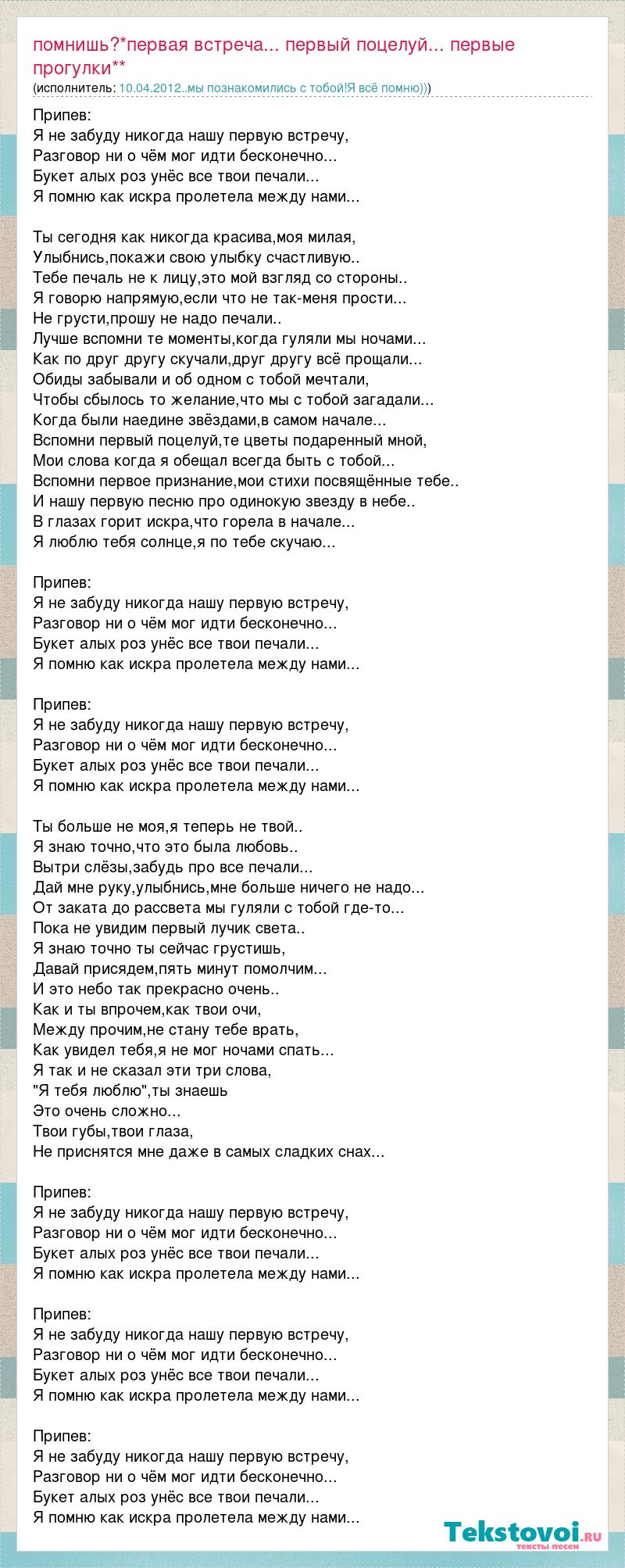 Припев: Я не забуду никогда нашу первую встречу, Разговор ни о чём мог идти бесконечно... Букет алых роз унёс все твои печали... Я помню как искра пролетела между нами... Ты сегодня как никогда красива,моя милая, Улыбнись,покажи свою улыбку счастливую.. Тебе печаль не к лицу,это мой взгляд со стороны.. Я говорю напрямую,если что не так-меня прости... Не грусти,прошу не надо печали.. Лучше вспомни те моменты,когда гуляли мы ночами... Как по друг другу скучали,друг другу всё прощали... Обиды забывали и об одном с тобой мечтали, Чтобы сбылось то желание,что мы с тобой загадали... Когда были наедине звёздами,в самом начале... Вспомни первый поцелуй,те цветы подаренный мной, Мои слова когда я обещал всегда быть с тобой... Вспомни первое признание,мои стихи посвящённые тебе.. И нашу первую песню про одинокую звезду в небе.. В глазах горит искра,что горела в начале... Я люблю тебя солнце,я по тебе скучаю... Припев: Я не забуду никогда нашу первую встречу, Разговор ни о чём мог идти бесконечно... Букет алых роз унёс все твои печали... Я помню как искра пролетела между нами... Припев: Я не забуду никогда нашу первую встречу, Разговор ни о чём мог идти бесконечно... Букет алых роз унёс все твои печали... Я помню как искра пролетела между нами... Ты больше не моя,я теперь не твой.. Я знаю точно,что это была любовь.. Вытри слёзы,забудь про все печали... Дай мне руку,улыбнись,мне больше ничего не надо... От заката до рассвета мы гуляли с тобой где-то... Пока не увидим первый лучик света.. Я знаю точно ты сейчас грустишь, Давай присядем,пять минут помолчим... И это небо так прекрасно очень.. Как и ты впрочем,как твои очи, Между прочим,не стану тебе врать, Как увидел тебя,я не мог ночами спать... Я так и не сказал эти три слова, "Я тебя люблю",ты знаешь Это очень сложно... Твои губы,твои глаза, Не приснятся мне даже в самых сладких снах... Припев: Я не забуду никогда нашу первую встречу, Разговор ни о чём мог идти бесконечно... Букет алых роз унёс все твои печали... Я помню как искра пролетела между нами... Припев: Я не забуду никогда нашу первую встречу, Разговор ни о чём мог идти бесконечно... Букет алых роз унёс все твои печали... Я помню как искра пролетела между нами... Припев: Я не забуду никогда нашу первую встречу, Разговор ни о чём мог идти бесконечно... Букет алых роз унёс все твои печали... Я помню как искра пролетела между нами...