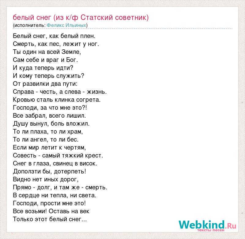 Белый снег, как белый плен. Смерть, как пес, лежит у ног. Ты один на всей Земле, Сам себе и враг и Бог. И куда теперь идти? И кому теперь служить? От развилки два пути: Справа - честь, а слева - жизнь. Кровью сталь клинка согрета. Господи, за что мне это?! Все забрал, всего лишил. Душу вынул, боль вложил. То ли плаха, то ли храм, То ли ангел, то ли бес. Если мир летит к чертям, Совесть - самый тяжкий крест. Снег в глаза, свинец в висок. Доползти бы, дотерпеть! Видно нет иных дорог, Прямо - долг, и там же - смерть. В сердце ни тепла, ни света. Господи, прости мне это! Все возьми! Оставь на век Только этот белый снег...