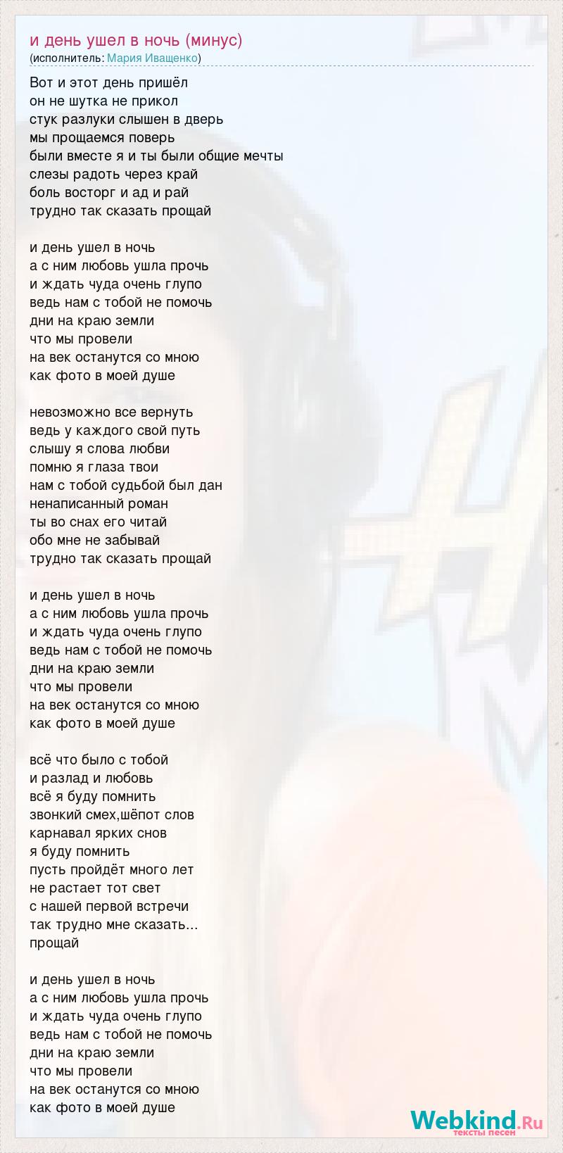 Вот и этот день пришёл он не шутка не прикол стук разлуки слышен в дверь мы прощаемся поверь были вместе я и ты были общие мечты слезы радоть через край боль восторг и ад и рай трудно так сказать прощай и день ушел в ночь а с ним любовь ушла прочь и ждать чуда очень глупо ведь нам с тобой не помочь дни на краю земли что мы провели на век останутся со мною как фото в моей душе невозможно все вернуть ведь у каждого свой путь слышу я слова любви помню я глаза твои нам с тобой судьбой был дан ненаписанный роман ты во снах его читай обо мне не забывай трудно так сказать прощай и день ушел в ночь а с ним любовь ушла прочь и ждать чуда очень глупо ведь нам с тобой не помочь дни на краю земли что мы провели на век останутся со мною как фото в моей душе всё что было с тобой и разлад и любовь всё я буду помнить звонкий смех,шёпот слов карнавал ярких снов я буду помнить пусть пройдёт много лет не растает тот свет с нашей первой встречи так трудно мне сказать... прощай и день ушел в ночь а с ним любовь ушла прочь и ждать чуда очень глупо ведь нам с тобой не помочь дни на краю земли что мы провели на век останутся со мною как фото в моей душе