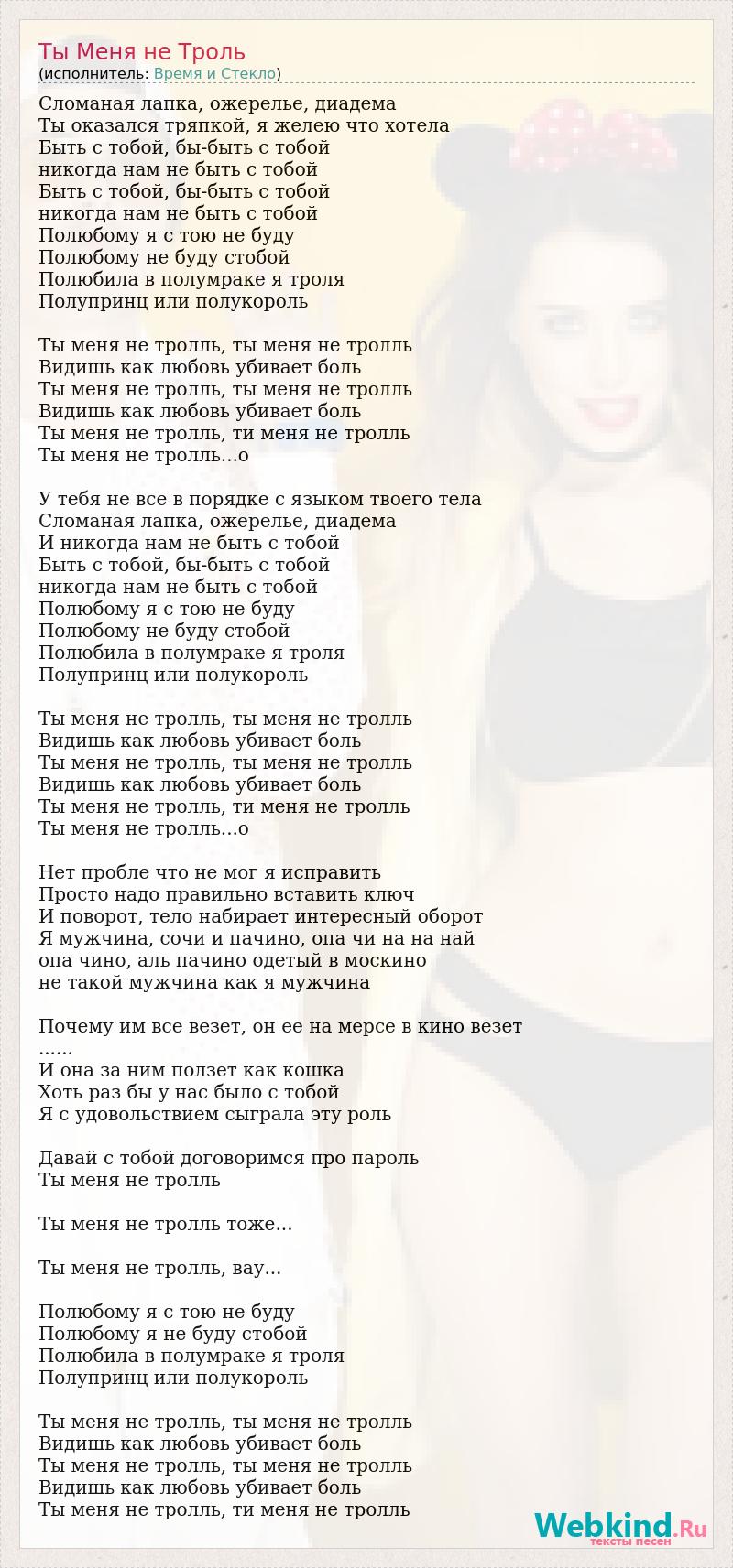 Сломаная лапка, ожерелье, диадема Ты оказался тряпкой, я желею что хотела Быть с тобой, бы-быть с тобой никогда нам не быть с тобой Быть с тобой, бы-быть с тобой никогда нам не быть с тобой Полюбому я с тою не буду Полюбому не буду стобой Полюбила в полумраке я троля Полупринц или полукороль Ты меня не тролль, ты меня не тролль Видишь как любовь убивает боль Ты меня не тролль, ты меня не тролль Видишь как любовь убивает боль Ты меня не тролль, ти меня не тролль Ты меня не тролль...о У тебя не все в порядке с языком твоего тела Сломаная лапка, ожерелье, диадема И никогда нам не быть с тобой Быть с тобой, бы-быть с тобой никогда нам не быть с тобой Полюбому я с тою не буду Полюбому не буду стобой Полюбила в полумраке я троля Полупринц или полукороль Ты меня не тролль, ты меня не тролль Видишь как любовь убивает боль Ты меня не тролль, ты меня не тролль Видишь как любовь убивает боль Ты меня не тролль, ти меня не тролль Ты меня не тролль...о Нет пробле что не мог я исправить Просто надо правильно вставить ключ И поворот, тело набирает интересный оборот Я мужчина, сочи и пачино, опа чи на на най опа чино, аль пачино одетый в москино не такой мужчина как я мужчина Почему им все везет, он ее на мерсе в кино везет ...... И она за ним ползет как кошка Хоть раз бы у нас было с тобой Я с удовольствием сыграла эту роль Давай с тобой договоримся про пароль Ты меня не тролль Ты меня не тролль тоже... Ты меня не тролль, вау... Полюбому я с тою не буду Полюбому я не буду стобой Полюбила в полумраке я троля Полупринц или полукороль Ты меня не тролль, ты меня не тролль Видишь как любовь убивает боль Ты меня не тролль, ты меня не тролль Видишь как любовь убивает боль Ты меня не тролль, ти меня не тролль