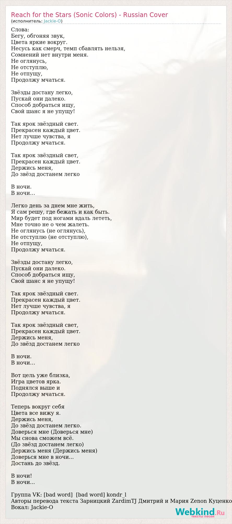 Слова: Бегу, обгоняя звук, Цвета яркие вокруг. Несусь как смерч, темп сбавлять нельзя, Сомнений нет внутри меня. Не оглянусь, Не отступлю, Не отпущу, Продолжу мчаться. Звёзды достану легко, Пускай они далеко. Способ добраться ищу, Свой шанс я не упущу! Так ярок звёздный свет. Прекрасен каждый цвет. Нет лучше чувства, я Продолжу мчаться. Так ярок звёздный свет, Прекрасен каждый цвет. Держись меня, До звёзд достанем легко В ночи. В ночи… Легко день за днем мне жить, Я сам решу, где бежать и как быть. Мир будет под ногами вдаль лететь, Мне точно не о чем жалеть. Не оглянусь (не оглянусь), Не отступлю (не отступлю), Не отпущу, Продолжу мчаться. Звёзды достану легко, Пускай они далеко. Способ добраться ищу, Свой шанс я не упущу! Так ярок звёздный свет. Прекрасен каждый цвет. Нет лучше чувства, я Продолжу мчаться. Так ярок звёздный свет, Прекрасен каждый цвет. Держись меня, До звёзд достанем легко В ночи. В ночи… Вот цель уже близка, Игра цветов ярка. Поднялся выше и Продолжу мчаться. Теперь вокруг себя Цвета все вижу я. Держись меня, До звёзд достанем легко. Доверься мне (Доверься мне) Мы снова сможем всё. (До звёзд достанем легко) Держись меня (Держись меня) Доверься мне в ночи... Достань до звёзд. В ночи! В ночи... Группа VK: [bad word] [bad word] kondr_l Авторы перевода текста Зарницкий ZardimTJ Дмитрий и Мария Zenon Куценко Вокал: Jackie-O