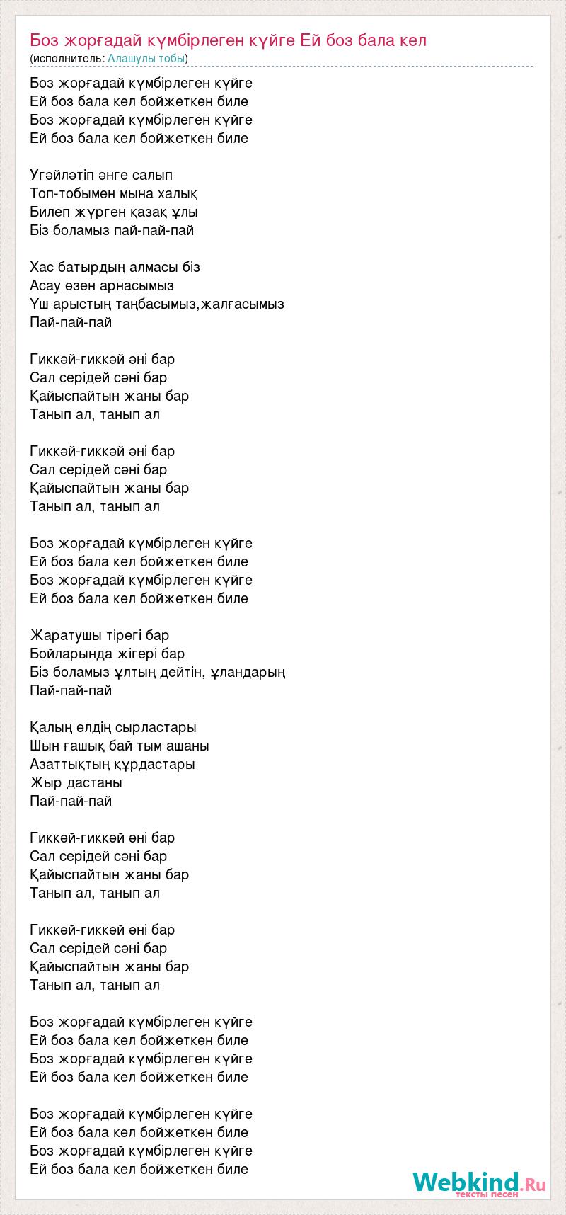 Боз жорғадай күмбірлеген күйге Ей боз бала кел бойжеткен биле Боз жорғадай күмбірлеген күйге Ей боз бала кел бойжеткен биле Угәйләтіп әнге салып Топ-тобымен мына халық Билеп жүрген қазақ ұлы Біз боламыз пай-пай-пай Хас батырдың алмасы біз Асау өзен арнасымыз Үш арыстың таңбасымыз,жалғасымыз Пай-пай-пай Гиккәй-гиккәй әні бар Сал серідей сәні бар Қайыспайтын жаны бар Танып ал, танып ал Гиккәй-гиккәй әні бар Сал серідей сәні бар Қайыспайтын жаны бар Танып ал, танып ал Боз жорғадай күмбірлеген күйге Ей боз бала кел бойжеткен биле Боз жорғадай күмбірлеген күйге Ей боз бала кел бойжеткен биле Жаратушы тірегі бар Бойларында жігері бар Біз боламыз ұлтың дейтін, ұландарың Пай-пай-пай Қалың елдің сырластары Шын ғашық бай тым ашаны Азаттықтың құрдастары Жыр дастаны Пай-пай-пай Гиккәй-гиккәй әні бар Сал серідей сәні бар Қайыспайтын жаны бар Танып ал, танып ал Гиккәй-гиккәй әні бар Сал серідей сәні бар Қайыспайтын жаны бар Танып ал, танып ал Боз жорғадай күмбірлеген күйге Ей боз бала кел бойжеткен биле Боз жорғадай күмбірлеген күйге Ей боз бала кел бойжеткен биле Боз жорғадай күмбірлеген күйге Ей боз бала кел бойжеткен биле Боз жорғадай күмбірлеген күйге Ей боз бала кел бойжеткен биле