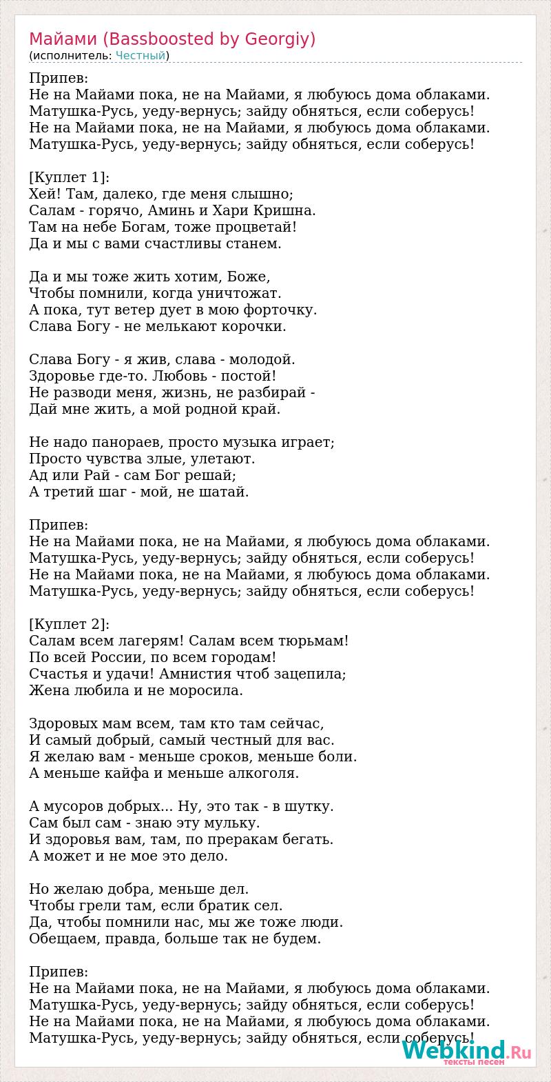 Припев: Не на Майами пока, не на Майами, я любуюсь дома облаками. Матушка-Русь, уеду-вернусь; зайду обняться, если соберусь! Не на Майами пока, не на Майами, я любуюсь дома облаками. Матушка-Русь, уеду-вернусь; зайду обняться, если соберусь! [Куплет 1]: Хей! Там, далеко, где меня слышно; Салам - горячо, Аминь и Хари Кришна. Там на небе Богам, тоже процветай! Да и мы с вами счастливы станем. Да и мы тоже жить хотим, Боже, Чтобы помнили, когда уничтожат. А пока, тут ветер дует в мою форточку. Слава Богу - не мелькают корочки. Слава Богу - я жив, слава - молодой. Здоровье где-то. Любовь - постой! Не разводи меня, жизнь, не разбирай - Дай мне жить, а мой родной край. Не надо панораев, просто музыка играет; Просто чувства злые, улетают. Ад или Рай - сам Бог решай; А третий шаг - мой, не шатай. Припев: Не на Майами пока, не на Майами, я любуюсь дома облаками. Матушка-Русь, уеду-вернусь; зайду обняться, если соберусь! Не на Майами пока, не на Майами, я любуюсь дома облаками. Матушка-Русь, уеду-вернусь; зайду обняться, если соберусь! [Куплет 2]: Салам всем лагерям! Салам всем тюрьмам! По всей России, по всем городам! Счастья и удачи! Амнистия чтоб зацепила; Жена любила и не моросила. Здоровых мам всем, там кто там сейчас, И самый добрый, самый честный для вас. Я желаю вам - меньше сроков, меньше боли. А меньше кайфа и меньше алкоголя. А мусоров добрых... Ну, это так - в шутку. Сам был сам - знаю эту мульку. И здоровья вам, там, по преракам бегать. А может и не мое это дело. Но желаю добра, меньше дел. Чтобы грели там, если братик сел. Да, чтобы помнили нас, мы же тоже люди. Обещаем, правда, больше так не будем. Припев: Не на Майами пока, не на Майами, я любуюсь дома облаками. Матушка-Русь, уеду-вернусь; зайду обняться, если соберусь! Не на Майами пока, не на Майами, я любуюсь дома облаками. Матушка-Русь, уеду-вернусь; зайду обняться, если соберусь!