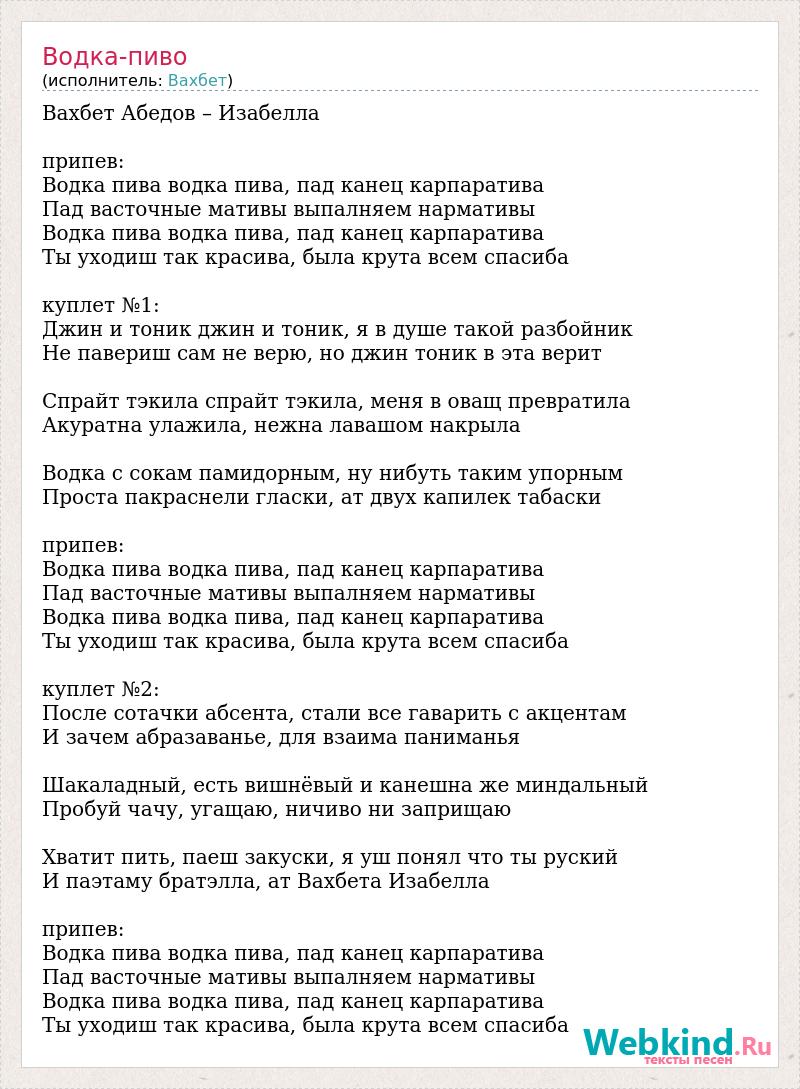 Вахбет Абедов – Изабелла припев: Водка пива водка пива, пад канец карпаратива Пад васточные мативы выпалняем нармативы Водка пива водка пива, пад канец карпаратива Ты уходиш так красива, была крута всем спасиба куплет №1: Джин и тоник джин и тоник, я в душе такой разбойник Не павериш сам не верю, но джин тоник в эта верит Спрайт тэкила спрайт тэкила, меня в оващ превратила Акуратна улажила, нежна лавашом накрыла Водка с сокам памидорным, ну нибуть таким упорным Проста пакраснели гласки, ат двух капилек табаски припев: Водка пива водка пива, пад канец карпаратива Пад васточные мативы выпалняем нармативы Водка пива водка пива, пад канец карпаратива Ты уходиш так красива, была крута всем спасиба куплет №2: После сотачки абсента, стали все гаварить с акцентам И зачем абразаванье, для взаима паниманья Шакаладный, есть вишнёвый и канешна же миндальный Пробуй чачу, угащаю, ничиво ни заприщаю Хватит пить, паеш закуски, я уш понял что ты руский И паэтаму братэлла, ат Вахбета Изабелла припев: Водка пива водка пива, пад канец карпаратива Пад васточные мативы выпалняем нармативы Водка пива водка пива, пад канец карпаратива Ты уходиш так красива, была крута всем спасиба
