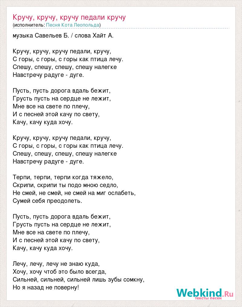 музыка Савельев Б. / слова Хайт А. Кручу, кручу, кручу педали, кручу, С горы, с горы, с горы как птица лечу. Спешу, спешу, спешу, спешу налегке Навстречу радуге - дуге. Пусть, пусть дорога вдаль бежит, Грусть пусть на сердце не лежит, Мне все на свете по плечу, И с песней этой качу по свету, Качу, качу куда хочу. Кручу, кручу, кручу педали, кручу, С горы, с горы, с горы как птица лечу. Спешу, спешу, спешу, спешу налегке Навстречу радуге - дуге. Терпи, терпи, терпи когда тяжело, Скрипи, скрипи ты подо мною седло, Не смей, не смей, не смей на миг ослабеть, Сумей себя преодолеть. Пусть, пусть дорога вдаль бежит, Грусть пусть на сердце не лежит, Мне все на свете по плечу, И с песней этой качу по свету, Качу, качу куда хочу. Лечу, лечу, лечу не знаю куда, Хочу, хочу чтоб это было всегда, Сильней, сильней, сильней лишь зубы сомкну, Но я назад не поверну!