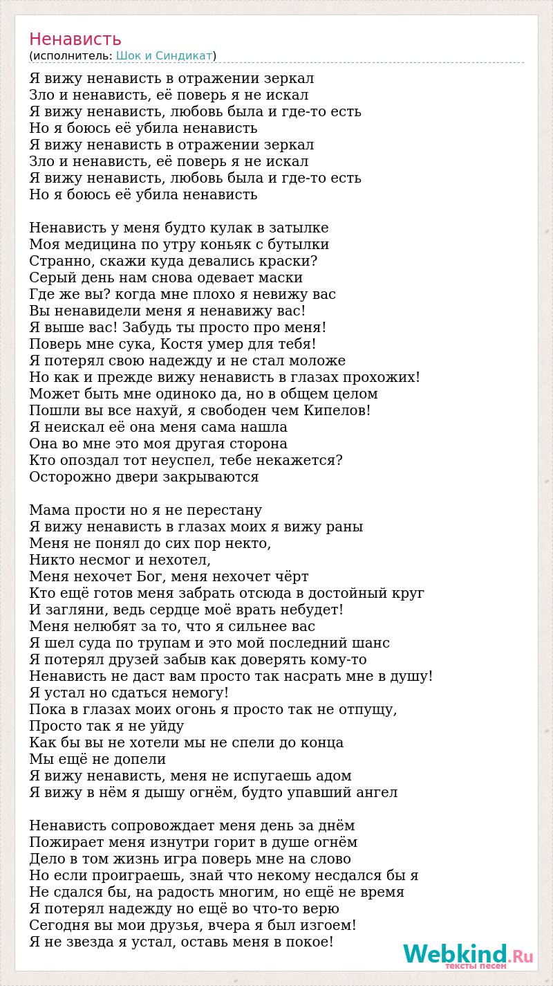 Я вижу ненависть в отражении зеркал Зло и ненависть, её поверь я не искал Я вижу ненависть, любовь была и где-то есть Но я боюсь её убила ненависть Я вижу ненависть в отражении зеркал Зло и ненависть, её поверь я не искал Я вижу ненависть, любовь была и где-то есть Но я боюсь её убила ненависть Ненависть у меня будто кулак в затылке Моя медицина по утру коньяк с бутылки Странно, скажи куда девались краски? Серый день нам снова одевает маски Где же вы? когда мне плохо я невижу вас Вы ненавидели меня я ненавижу вас! Я выше вас! Забудь ты просто про меня! Поверь мне сука, Костя умер для тебя! Я потерял свою надежду и не стал моложе Но как и прежде вижу ненависть в глазах прохожих! Может быть мне одиноко да, но в общем целом Пошли вы все нахуй, я свободен чем Кипелов! Я неискал её она меня сама нашла Она во мне это моя другая сторона Кто опоздал тот неуспел, тебе некажется? Осторожно двери закрываются Мама прости но я не перестану Я вижу ненависть в глазах моих я вижу раны Меня не понял до сих пор некто, Никто несмог и нехотел, Меня нехочет Бог, меня нехочет чёрт Кто ещё готов меня забрать отсюда в достойный круг И загляни, ведь сердце моё врать небудет! Меня нелюбят за то, что я сильнее вас Я шел суда по трупам и это мой последний шанс Я потерял друзей забыв как доверять кому-то Ненависть не даст вам просто так насрать мне в душу! Я устал но сдаться немогу! Пока в глазах моих огонь я просто так не отпущу, Просто так я не уйду Как бы вы не хотели мы не спели до конца Мы ещё не допели Я вижу ненависть, меня не испугаешь адом Я вижу в нём я дышу огнём, будто упавший ангел Ненависть сопровождает меня день за днём Пожирает меня изнутри горит в душе огнём Дело в том жизнь игра поверь мне на слово Но если проиграешь, знай что некому несдался бы я Не сдался бы, на радость многим, но ещё не время Я потерял надежду но ещё во что-то верю Сегодня вы мои друзья, вчера я был изгоем! Я не звезда я устал, оставь меня в покое!