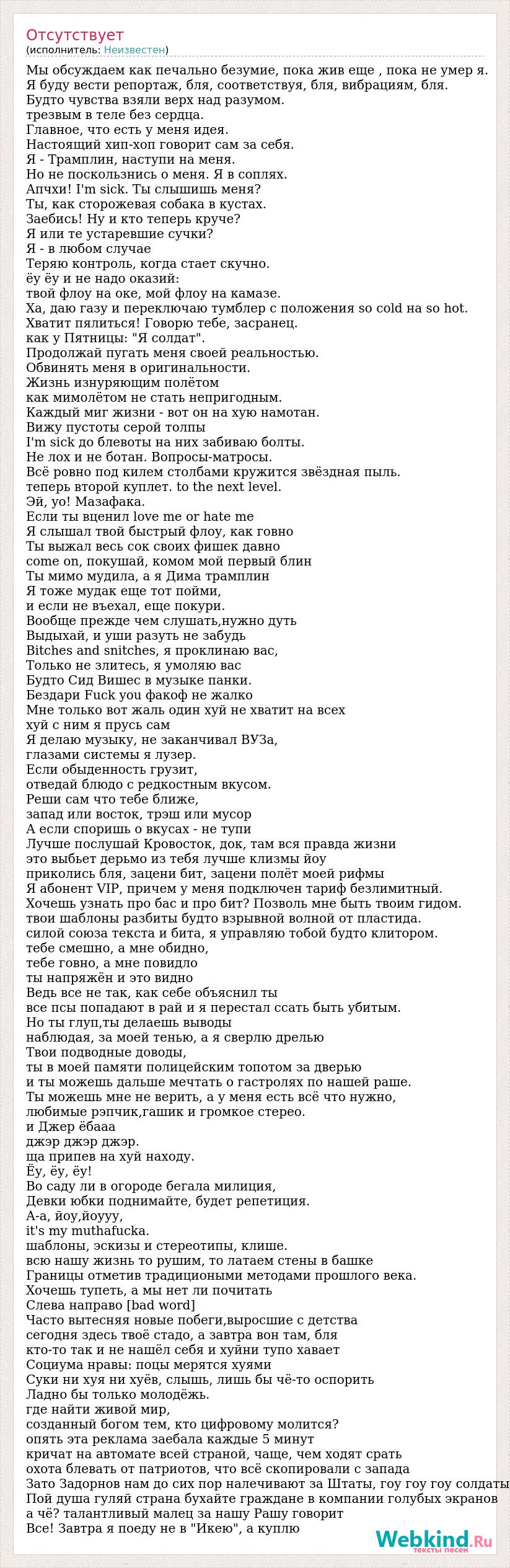 Мы обсуждаем как печально безумие, пока жив еще , пока не умер я. Я буду вести репортаж, бля, соответствуя, бля, вибрациям, бля. Будто чувства взяли верх над разумом. трезвым в теле без сердца. Главное, что есть у меня идея. Настоящий хип-хоп говорит сам за себя. Я - Трамплин, наступи на меня. Но не поскользнись о меня. Я в соплях. Апчхи! I'm sick. Ты слышишь меня? Ты, как сторожевая собака в кустах. Заебись! Ну и кто теперь круче? Я или те устаревшие сучки? Я - в любом случае Теряю контроль, когда стает скучно. ёу ёу и не надо оказий: твой флоу на оке, мой флоу на камазе. Ха, даю газу и переключаю тумблер с положения so cold на so hot. Хватит пялиться! Говорю тебе, засранец. как у Пятницы: "Я солдат". Продолжай пугать меня своей реальностью. Обвинять меня в оригинальности. Жизнь изнуряющим полётом как мимолётом не стать непригодным. Каждый миг жизни - вот он на хую намотан. Вижу пустоты серой толпы I'm sick до блевоты на них забиваю болты. Не лох и не ботан. Вопросы-матросы. Всё ровно под килем столбами кружится звёздная пыль. теперь второй куплет. to the next level. Эй, yo! Мазафака. Если ты вценил love me or hate me Я слышал твой быстрый флоу, как говно Ты выжал весь сок своих фишек давно come on, покушай, комом мой первый блин Ты мимо мудила, а я Дима трамплин Я тоже мудак еще тот пойми, и если не въехал, еще покури. Вообще прежде чем слушать,нужно дуть Выдыхай, и уши разуть не забудь Bitches and snitches, я проклинаю вас, Только не злитесь, я умоляю вас Будто Сид Вишес в музыке панки. Бездари Fuck you факоф не жалко Мне только вот жаль один хуй не хватит на всех хуй с ним я прусь сам Я делаю музыку, не заканчивал ВУЗа, глазами системы я лузер. Если обыденность грузит, отведай блюдо с редкостным вкусом. Реши сам что тебе ближе, запад или восток, трэш или мусор А если споришь о вкусах - не тупи Лучше послушай Кровосток, док, там вся правда жизни это выбьет дерьмо из тебя лучше клизмы йоу приколись бля, зацени бит, зацени полёт моей рифмы Я абонент VIP, причем у меня подключен тариф безлимитный. Хочешь узнать про бас и про бит? Позволь мне быть твоим гидом. твои шаблоны разбиты будто взрывной волной от пластида. силой союза текста и бита, я управляю тобой будто клитором. тебе смешно, а мне обидно, тебе говно, а мне повидло ты напряжён и это видно Ведь все не так, как себе объяснил ты все псы попадают в рай и я перестал ссать быть убитым. Но ты глуп,ты делаешь выводы наблюдая, за моей тенью, а я сверлю дрелью Твои подводные доводы, ты в моей памяти полицейским топотом за дверью и ты можешь дальше мечтать о гастролях по нашей раше. Ты можешь мне не верить, а у меня есть всё что нужно, любимые рэпчик,гашик и громкое стерео. и Джер ёбааа джэр джэр джэр. ща припев на хуй находу. Ёу, ёу, ёу! Во саду ли в огороде бегала милиция, Девки юбки поднимайте, будет репетиция. А-а, йоу,йоууу, it's my muthafucka. шаблоны, эскизы и стереотипы, клише. всю нашу жизнь то рушим, то латаем стены в башке Границы отметив традициоными методами прошлого века. Хочешь тупеть, а мы нет ли почитать Слева направо [bad word] Часто вытесняя новые побеги,выросшие с детства сегодня здесь твоё стадо, а завтра вон там, бля кто-то так и не нашёл себя и хуйни тупо хавает Социума нравы: поцы мерятся хуями Суки ни хуя ни хуёв, слышь, лишь бы чё-то оспорить Ладно бы только молодёжь. где найти живой мир, созданный богом тем, кто цифровому молится? опять эта реклама заебала каждые 5 минут кричат на автома
