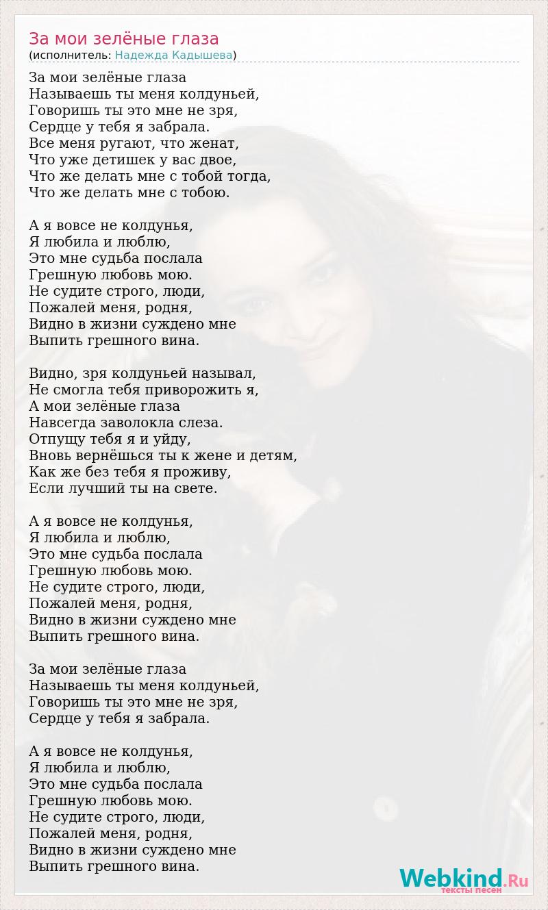 За мои зелёные глаза Называешь ты меня колдуньей, Говоришь ты это мне не зря, Сердце у тебя я забрала. Все меня ругают, что женат, Что уже детишек у вас двое, Что же делать мне с тобой тогда, Что же делать мне с тобою. А я вовсе не колдунья, Я любила и люблю, Это мне судьба послала Грешную любовь мою. Не судите строго, люди, Пожалей меня, родня, Видно в жизни суждено мне Выпить грешного вина. Видно, зря колдуньей называл, Не смогла тебя приворожить я, А мои зелёные глаза Навсегда заволокла слеза. Отпущу тебя я и уйду, Вновь вернёшься ты к жене и детям, Как же без тебя я проживу, Если лучший ты на свете. А я вовсе не колдунья, Я любила и люблю, Это мне судьба послала Грешную любовь мою. Не судите строго, люди, Пожалей меня, родня, Видно в жизни суждено мне Выпить грешного вина. За мои зелёные глаза Называешь ты меня колдуньей, Говоришь ты это мне не зря, Сердце у тебя я забрала. А я вовсе не колдунья, Я любила и люблю, Это мне судьба послала Грешную любовь мою. Не судите строго, люди, Пожалей меня, родня, Видно в жизни суждено мне Выпить грешного вина.