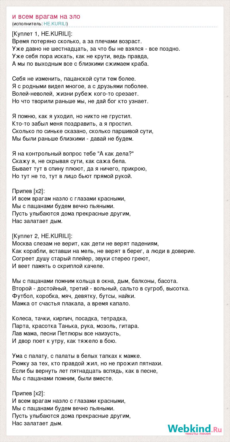 [Куплет 1, HE.KURILI]: Время потеряно сколько, а за плечами возраст. Уже давно не шестнадцать, за что бы не взялся - все поздно. Уже себя пора искать, как не крути, ведь правда, А мы по выходным все с близкими сжимаем краба. Себя не изменить, пацанской сути тем более. Я с родными видел многое, а с друзьями поболее. Волей-неволей, жизни рубеж кого-то срезает. Но что творили раньше мы, не дай бог кто узнает. Я помню, как я уходил, но никто не грустил. Кто-то забыл меня поздравить, а я простил. Сколько по синьке сказано, сколько паршивой сути, Мы были раньше близкими - давай не будем. Я на контрольный вопрос тебе "А как дела?" Скажу я, не скрывая сути, как сажа бела. Бывает тут в спину плюют, да я ничего, прикрою, Но тут не то, тут в лицо бьют прямой рукой. Припев [x2]: И всем врагам назло с глазами красными, Мы с пацанами будем вечно пьяными. Пусть улыбаются дома прекрасные другим, Нас залатает дым. [Куплет 2, HE.KURILI]: Москва слезам не верит, как дети не верят падениям, Как корабли, вставши на мель, не верят в берег, а люди в доверие. Согреет душу старый плейер, звуки стерео греют, И веет память о скриплой качеле. Мы с пацанами помним кольца в окна, дым, балконы, басота. Второй - достойный, третий - вольный, сальто в сугроб, высотка. Футбол, коробка, мяч, девятку, бутсы, найки. Мамка от счастья плакала, а время капало. Колеса, тачки, кирпич, посадка, тетрадка, Парта, красотка Танька, рука, мозоль, гитара. Лав мама, песни Петлюры все наизусть, И двор поет к утру, как тяжело в бою. Ума с палату, с палаты в белых тапках к мамке. Рюмку за тех, кто правдой жил, но не прожил пятнахи. Если бы вернуть лет пятнадцать вспядь, как в песне, Мы с пацанами помним, были вместе. Припев [x2]: И всем врагам назло с глазами красными, Мы с пацанами будем вечно пьяными. Пусть улыбаются дома прекрасные другим, Нас залатает дым.
