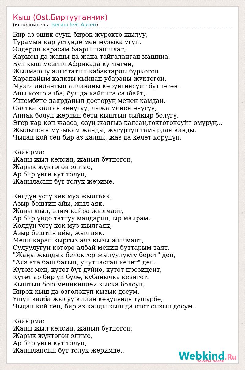 Бир аз эшик суук, бирок жүрөктө жылуу, Турамын кар үстүндө мен музыка угуп. Элдерди карасам баары шашылат, Карысы да жашы да жана тайгаланган машина. Бул кыш мезгил Африкада күтпөгөн, Жылмаюну алыстатып кабактарды бүркөгөн. Карапайым калкты кыйнап убараны жүктөгөн, Музга айлантып айлананы көрүнгөнсүйт бүтпөгөн. Аны көзгө алба, бул да кайгыга салбайт, Ишембиге даярданып досторуң менен камдан. Салтка калган көнүгүү, лыжа менен өнүгүү, Аппак болуп жердин бети кыштын сыйкыр бөлүгү. Эгер кар көп жааса, өзүң жалгыз калсаң,токтогонсуйт өмүрүң... Жылытсын музыкам жанды, жүгүртүп тамырдан канды. Чыдап кой сен бир аз калды, жаз да келет көрүнүп. Кайырма: Жаңы жыл келсин, жанып бүтпөгөн, Жарык жүктөгөн элиме, Ар бир үйгө кут толуп, Жаңыласын бүт толук жериме. Көлдүн үстү көк муз жылгаяк, Азыр бештин айы, жыл аяк. Жаңы жыл, элим кайра жылмаят, Ар бир үйдө таттуу мандарин, ыр майрам. Көлдүн үстү көк муз жылгаяк, Азыр бештин айы, жыл аяк. Мени карап кыргыз аяз кызы жылмаят, Сулуулугун көтөрө албай менин буттарым таят. "Жаңы жылдык белектер жылуулукту берет" деп, "Аяз ата баш багып, унутпастан келет" деп. Күтөм мен, күтөт бүт дүйнө, күтөт президент, Күтөт ар бир үй бүлө, кубанычка кезигет. Кыштын бою меникиндей кыска болсун, Бирок кыш да өзгөлөнүп кызык досум. Үшүп калба жылуу кийин көңүлүңдү түшүрбө, Чыдап кой сен, бир аз калды кыш да өтөт сызып досум. Кайырма: Жаңы жыл келсин, жанып бүтпөгөн, Жарык жүктөгөн элиме, Ар бир үйгө кут толуп, Жаңылансын бүт толук жеримде..