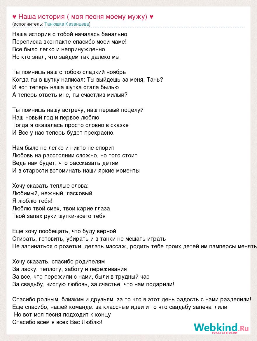 Наша история с тобой началась банально Переписка вконтакте-спасибо моей маме! Все было легко и непринужденно Но кто знал, что зайдем так далеко мы Ты помнишь наш с тобою сладкий ноябрь Когда ты в шутку написал: Ты выйдешь за меня, Тань? И вот теперь наша шутка стала былью А теперь ответь мне, ты счастлив милый? Ты помнишь нашу встречу, наш первый поцелуй Наш новый год и первое люблю Тогда я оказалась просто словно в сказке И Все у нас теперь будет прекрасно. Нам было не легко и никто не спорит Любовь на расстоянии сложно, но того стоит Ведь нам будет, что рассказать детям И в старости вспоминать наши яркие моменты Хочу сказать теплые слова: Любимый, нежный, ласковый Я люблю тебя! Люблю твой смех, твои карие глаза Твой запах руки шутки-всего тебя Еще хочу пообещать, что буду верной Стирать, готовить, убирать и в танки не мешать играть Не запинаться о розетки, делать массаж, родить тебе троих детей им памперсы менять Хочу сказать, спасибо родителям За ласку, теплоту, заботу и переживания За все, что пережили с нами, были в трудный час За свадьбу, чистую любовь, за счастье, что нам подарили! Спасибо родным, близким и друзьям, за то что в этот день радость с нами разделили! Еще спасибо, нашей команде: за классные идеи и то что свадьбу запечатлили Но вот моя песня подходит к концу Спасибо всем я всех Вас Люблю!