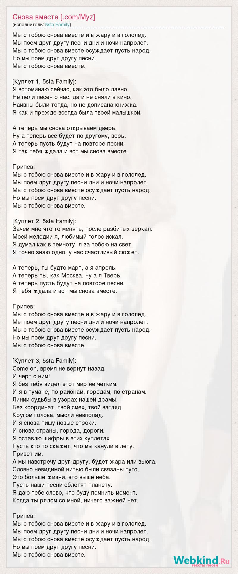 Мы с тобою снова вместе и в жару и в гололед. Мы поем друг другу песни дни и ночи напролет. Мы с тобою снова вместе осуждает пусть народ. Но мы поем друг другу песни. Мы с тобою снова вместе. [Куплет 1, 5sta Family]: Я вспоминаю сейчас, как это было давно. Не пели песен о нас, да и не сняли в кино. Наивны были тогда, но не дописана книжка. Я как и прежде всегда была твоей малышкой. А теперь мы снова открываем дверь. Ну а теперь все будет по другому, верь. А теперь пусть будут на повторе песни. Я так тебя ждала и вот мы снова вместе. Припев: Мы с тобою снова вместе и в жару и в гололед. Мы поем друг другу песни дни и ночи напролет. Мы с тобою снова вместе осуждает пусть народ. Но мы поем друг другу песни. Мы с тобою снова вместе. [Куплет 2, 5sta Family]: Зачем мне что то менять, после разбитых зеркал. Моей мелодии я, любимый голос искал. Я думал как в темноту, я за тобою на свет. Я точно знаю одно, у нас счастливый сюжет. А теперь, ты будто март, а я апрель. А теперь ты, как Москва, ну а я Тверь. А теперь пусть будут на повторе песни. Я тебя ждала и вот мы снова вместе. Припев: Мы с тобою снова вместе и в жару и в гололед. Мы поем друг другу песни дни и ночи напролет. Мы с тобою снова вместе осуждает пусть народ. Но мы поем друг другу песни. Мы с тобою снова вместе. [Куплет 3, 5sta Family]: Come on, время не вернут назад. И черт с ним! Я без тебя видел этот мир не четким. И я в тумане, по районам, городам, по странам. Линии судьбы в узорах нашей драмы. Без координат, твой смех, твой взгляд. Кругом голова, мысли невпопад. И я снова пишу новые строки. И снова страны, города, дороги. Я оставлю шифры в этих куплетах. Пусть кто то скажет, что мы канули в лету. Привет им. А мы навстречу друг-другу, будет жара или вьюга. Словно невидимой нитью были связаны туго. Это больше жизни, это выше неба. Пусть наши песни облетят планету. Я даю тебе слово, что буду помнить момент. Когда ты рядом со мной, ничего важней нет. Припев: Мы с тобою снова вместе и в жару и в гололед. Мы поем друг другу песни дни и ночи напролет. Мы с тобою снова вместе осуждает пусть народ. Но мы поем друг другу песни. Мы с тобою снова вместе.