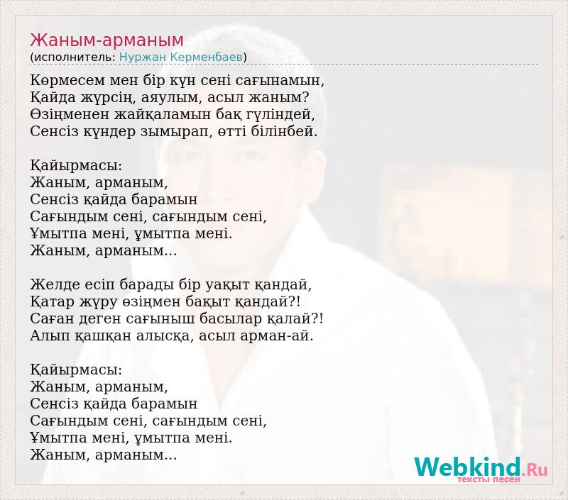 Көрмесем мен бір күн сені сағынамын, Қайда жүрсің, аяулым, асыл жаным? Өзіңменен жайқаламын бақ гүліндей, Сенсіз күндер зымырап, өтті білінбей. Қайырмасы: Жаным, арманым, Сенсіз қайда барамын Сағындым сені, сағындым сені, Ұмытпа мені, ұмытпа мені. Жаным, арманым... Желде есіп барады бір уақыт қандай, Қатар жүру өзіңмен бақыт қандай?! Саған деген сағыныш басылар қалай?! Алып қашқан алысқа, асыл арман-ай. Қайырмасы: Жаным, арманым, Сенсіз қайда барамын Сағындым сені, сағындым сені, Ұмытпа мені, ұмытпа мені. Жаным, арманым...