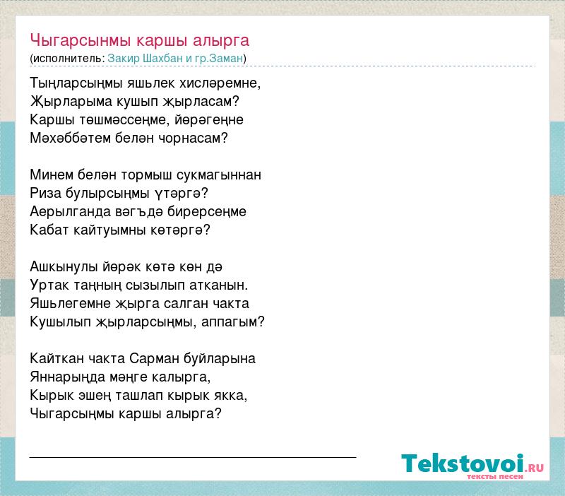 Тыңларсыңмы яшьлек хисләремне, Җырларыма кушып җырласам? Каршы төшмәссеңме, йөрәгеңне Мәхәббәтем белән чорнасам? Минем белән тормыш сукмагыннан Риза булырсыңмы үтәргә? Аерылганда вәгъдә бирерсеңме Кабат кайтуымны көтәргә? Ашкынулы йөрәк көтә көн дә Уртак таңның сызылып атканын. Яшьлегемне җырга салган чакта Кушылып җырларсыңмы, аппагым? Кайткан чакта Сарман буйларына Яннарыңда мәңге калырга, Кырык эшең ташлап кырык якка, Чыгарсыңмы каршы алырга? __________________________________________