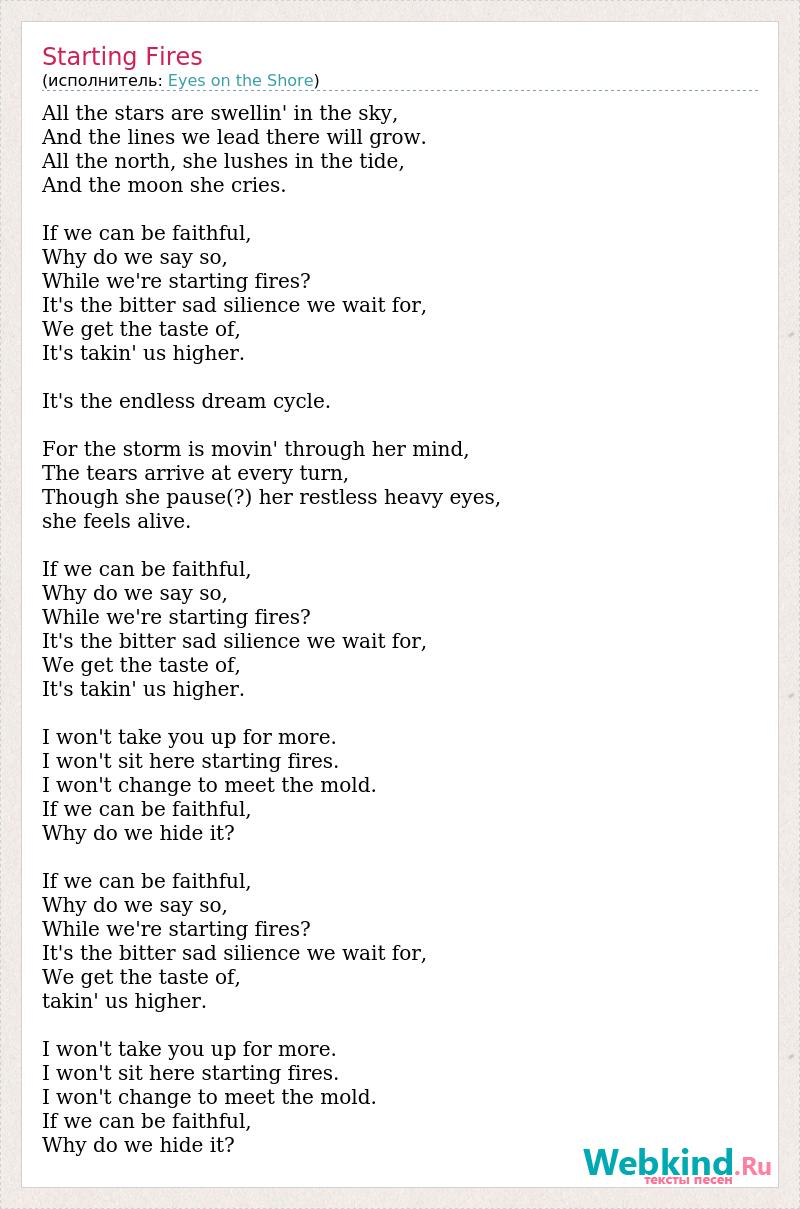 All the stars are swellin' in the sky, And the lines we lead there will grow. All the north, she lushes in the tide, And the moon she cries. If we can be faithful, Why do we say so, While we're starting fires? It's the bitter sad silience we wait for, We get the taste of, It's takin' us higher. It's the endless dream cycle. For the storm is movin' through her mind, The tears arrive at every turn, Though she pause(?) her restless heavy eyes, she feels alive. If we can be faithful, Why do we say so, While we're starting fires? It's the bitter sad silience we wait for, We get the taste of, It's takin' us higher. I won't take you up for more. I won't sit here starting fires. I won't change to meet the mold. If we can be faithful, Why do we hide it? If we can be faithful, Why do we say so, While we're starting fires? It's the bitter sad silience we wait for, We get the taste of, takin' us higher. I won't take you up for more. I won't sit here starting fires. I won't change to meet the mold. If we can be faithful, Why do we hide it?