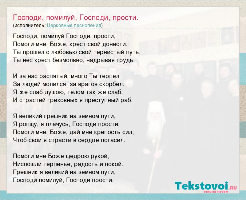 Господи, помилуй Господи, прости, Помоги мне, Боже, крест свой донести. Ты прошел с любовью свой тернистый путь, Ты нес крест безмолвно, надрывая грудь. И за нас распятый, много Ты терпел За людей молился, за врагов скорбел. Я же слаб душою, телом так же слаб, И страстей греховных я преступный раб. Я великий грешник на земном пути, Я ропщу, я плачусь, Господи прости, Помоги мне, Боже, дай мне крепость сил, Чтоб свои я страсти в сердце погасил. Помоги мне Боже щедрою рукой, Ниспошли терпенье, радость и покой. Грешник я великий на земном пути, Господи помилуй, Господи прости.