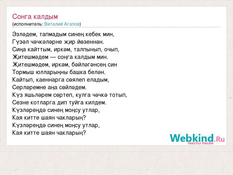 Эзләдем, тапмадым синең кебек мин, Гүзәл чәчкәләрне җир йөзеннән. Сиңа кайттым, иркәм, талпынып, очып, Җитешмәдем — соңга калдым мин. Җитешмәдем, иркәм, бәйләгәнсең син Тормыш юлларыңны башка белән. Кайтып, каеннарга сөялеп еладым, Серләремне аңа сөйләдем. Күз яшьләрем сөртеп, кулга чәчкә тотып, Сезне котларга дип туйга килдем. Күзләреңдә синең моңсу утлар, Кая китте шаян чакларың? Күзләреңдә синең моңсу утлар, Кая китте шаян чакларың?