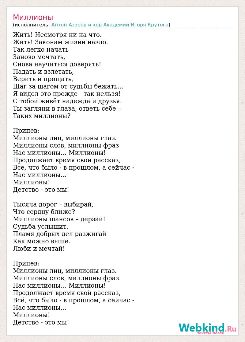 Жить! Несмотря ни на что. Жить! Законам жизни назло. Так легко начать Заново мечтать, Снова научиться доверять! Падать и взлетать, Верить и прощать, Шаг за шагом от судьбы бежать… Я видел это прежде - так нельзя! С тобой живёт надежда и друзья. Ты загляни в глаза, ответь себе – Таких миллионы? Припев: Миллионы лиц, миллионы глаз. Миллионы слов, миллионы фраз Нас миллионы… Миллионы! Продолжает время свой рассказ, Всё, что было - в прошлом, а сейчас - Нас миллионы… Миллионы! Детство - это мы! Тысяча дорог – выбирай, Что сердцу ближе? Миллионы шансов – дерзай! Судьба услышит. Пламя добрых дел разжигай Как можно выше. Люби и мечтай! Припев: Миллионы лиц, миллионы глаз. Миллионы слов, миллионы фраз Нас миллионы… Миллионы! Продолжает время свой рассказ, Всё, что было - в прошлом, а сейчас - Нас миллионы… Миллионы! Детство - это мы!