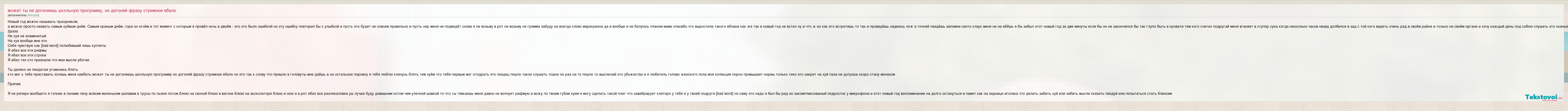 Новый год можно называть праздником, а можно просто назвать самым хуёвым днём. Самым сраным днём, гори он огнём и тот момент с которым я провёл ночь в двоём - это это было ошибкой но эту ошибку повторил бы с улыбкой и пусть это будет не совсем правельно и пусть хер меня не подведёт снова я не возьму в рот не возьму не грамма забуду на всегда слово марихуанна да и вообще я не балуюсь планом мама спасибо что выростила такого еблана как же так в новый год не встал ну и что ж но как его встретишь то так и проведёшь надеюсь лож а точнеё пиздёшь запомни санто клаус меня не на ебёшь я бы забыл этот новый год за две минуты если бы он не закончился бы так глупо быть в кровати тем кого считал подругай меня вганяет в ступор сука когда несколько часов нвзвд долбился в зад с той кого видеть очень рад в своём раёне и только на своём органе и хочу каждый день под собою слушать это оханье 2раза Не хуя не знаменитый На хуя вообще мне это Себя чувствую как [bad word] полюбивший лишь куплеты Я ебал все эти рифмы Я ебал все эти строки Я ебал тех кто признали что мои мысли убогие Ты далеко не пиздатая угомонись блять кто мог к тебе приставать хочешь меня наебать может ты не догоняешь школьную программу но догоняй фразу стремная ебало но это так к слову что пришло в головуты мне даёшь а на остальное поровну я тебя люблю кленусь блять тем хуём что тебя первым мог отодрать это пиздец пошло такое слушать тошно но раз на то пошло то выключай это убожество и я любитель голово женского пола моя колекция порно привышает нориы только тихо это сикрет на хуй паха не дотраха скоро стану монахом Припев Я не реперн вообщето я гопник в понаме лезу всяким маленьким шалавам в трусы по пьяне потом блюю на сенной блюю в вагоне блюю на эксколаторе блюю и ною я в рот ебал все разлекаловки уш лучше буду домашним котом чем улечной шавкой то что ты тявкаешь меня давно не волнует рифмую и вожу по твоим губам хуем я могу сделать такой плит что завибрирует клиторн у тебя и у твоей подруги [bad word] но каму это надо я был бы рад но закомпликсованый подросток у микрофона и этот новый год воспоминание на долго остануться в памят как на заднице иголака что делать забить хуй или забить мысли сказать пиздуй или попытаться стать блиским