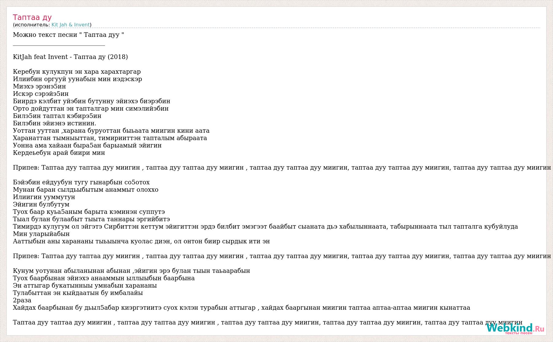 Можно текст песни " Таптаа дуу " ______________________________ KitJah feat Invent - Таптаа ду (2018) Керебун кулукпун эн хара харахтаргар Илиибин оргууй уунабын мин иэдэскэр Миэхэ эрэнэ5ин Искэр сэрэйэ5ин Биирдэ кэлбит уйэбин бутунну эйиэхэ биэрэбин Орто дойдуттан эн тапталгар мин симэлийэбин Билэ5ин таптал кэбирэ5ин Билэбин эйиэнэ истинин. Уоттан ууттан ,харана буруоттан быьаата миигин кини аата Харанаттан тымныыттан, тимирииттэн тапталым абыраата Уонна ама хайаан быра5ан барыамый эйигин Кердеьебун арай биири мин Припев: Таптаа дуу таптаа дуу миигин , таптаа дуу таптаа дуу миигин , таптаа дуу таптаа дуу миигин, таптаа дуу таптаа дуу миигин, таптаа дуу таптаа дуу миигин Бэйэбин ейдуубун тугу гынарбын со5отох Мунан баран сылдьыбытым анаммыт олоххо Илиигин ууммутун Эйигин булбутум Туох баар куьа5аным барыта кэминэн суппутэ Тыал булан булаабыт тыыта таннары эргийбитэ Тимирдэ кулугум ол эйгэтэ Сирбиттэн кеттум эйигиттэн эрдэ билбит эмэгээт баайбыт сыаната дьэ хабылыннаата, табырыннаата тыл тапталга кубуйлуда Мин уларыйабын Ааттыбын аны харананы тыьыынча куолас диэн, ол онтон биир сырдык ити эн Припев: Таптаа дуу таптаа дуу миигин , таптаа дуу таптаа дуу миигин , таптаа дуу таптаа дуу миигин, таптаа дуу таптаа дуу миигин, таптаа дуу таптаа дуу миигин Кунум уотунан абыланынан абынан ,эйигин эрэ булан тыын таьаарабын Туох баарбынан эйиэхэ анааммын ыллыыбын баарбына Эн аттыгар букатынныы умнабын харананы Тулабыттан эн кыйдаатын бу имбалайы 2раза Хайдах баарбынан бу дьыл5абар киэргэтиитэ суох кэлэн турабын аттыгар , хайдах бааргынан миигин таптаа аптаа-аптаа миигин кынаттаа Таптаа дуу таптаа дуу миигин , таптаа дуу таптаа дуу миигин , таптаа дуу таптаа дуу миигин, таптаа дуу таптаа дуу миигин, таптаа дуу таптаа дуу миигин