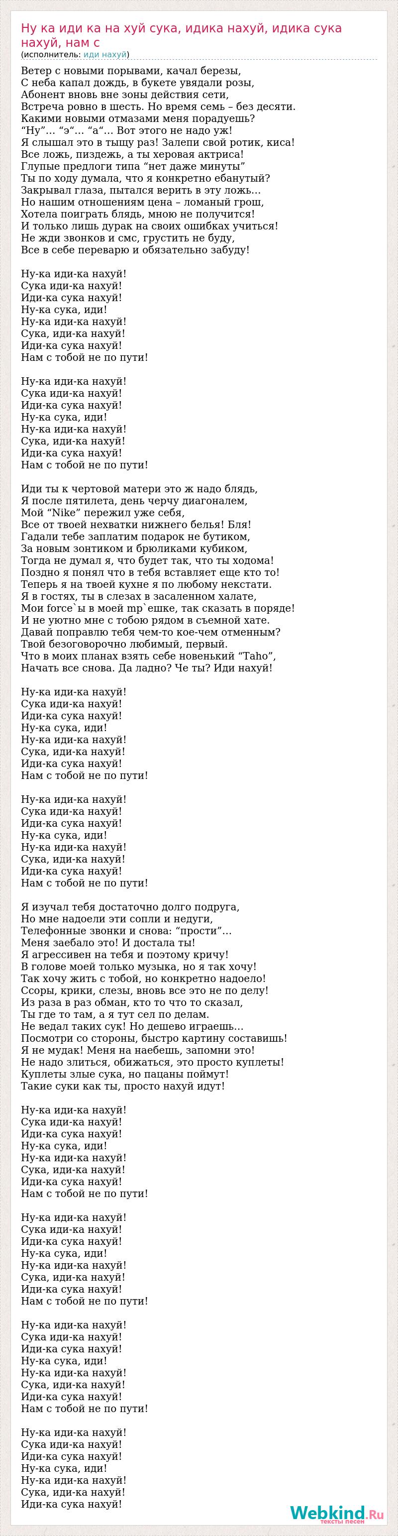 Ветер с новыми порывами, качал березы, С неба капал дождь, в букете увядали розы, Абонент вновь вне зоны действия сети, Встреча ровно в шесть. Но время семь – без десяти. Какими новыми отмазами меня порадуешь? “Ну”… “э“… “а“… Вот этого не надо уж! Я слышал это в тыщу раз! Залепи свой ротик, киса! Все ложь, пиздежь, а ты херовая актриса! Глупые предлоги типа “нет даже минуты” Ты по ходу думала, что я конкретно ебанутый? Закрывал глаза, пытался верить в эту ложь… Но нашим отношениям цена – ломаный грош, Хотела поиграть блядь, мною не получится! И только лишь дурак на своих ошибках учиться! Не жди звонков и смс, грустить не буду, Все в себе переварю и обязательно забуду! Ну-ка иди-ка нахуй! Сука иди-ка нахуй! Иди-ка сука нахуй! Ну-ка сука, иди! Ну-ка иди-ка нахуй! Сука, иди-ка нахуй! Иди-ка сука нахуй! Нам с тобой не по пути! Ну-ка иди-ка нахуй! Сука иди-ка нахуй! Иди-ка сука нахуй! Ну-ка сука, иди! Ну-ка иди-ка нахуй! Сука, иди-ка нахуй! Иди-ка сука нахуй! Нам с тобой не по пути! Иди ты к чертовой матери это ж надо блядь, Я после пятилета, день черчу диагоналем, Мой “Nike” пережил уже себя, Все от твоей нехватки нижнего белья! Бля! Гадали тебе заплатим подарок не бутиком, За новым зонтиком и брюликами кубиком, Тогда не думал я, что будет так, что ты ходома! Поздно я понял что в тебя вставляет еще кто то! Теперь я на твоей кухне я по любому некстати. Я в гостях, ты в слезах в засаленном халате, Мои force`ы в моей mp`ешке, так сказать в поряде! И не уютно мне с тобою рядом в съемной хате. Давай поправлю тебя чем-то кое-чем отменным? Твой безоговорочно любимый, первый. Что в моих планах взять себе новенький “Taho”, Начать все снова. Да ладно? Че ты? Иди нахуй! Ну-ка иди-ка нахуй! Сука иди-ка нахуй! Иди-ка сука нахуй! Ну-ка сука, иди! Ну-ка иди-ка нахуй! Сука, иди-ка нахуй! Иди-ка сука нахуй! Нам с тобой не по пути! Ну-ка иди-ка нахуй! Сука иди-ка нахуй! Иди-ка сука нахуй! Ну-ка сука, иди! Ну-ка иди-ка нахуй! Сука, иди-ка нахуй! Иди-ка сука нахуй! Нам с тобой не по пути! Я изучал тебя достаточно долго подруга, Но мне надоели эти сопли и недуги, Телефонные звонки и снова: “прости”… Меня заебало это! И достала ты! Я агрессивен на тебя и поэтому кричу! В голове моей только музыка, но я так хочу! Так хочу жить с тобой, но конкретно надоело! Ссоры, крики, слезы, вновь все это не по делу! Из раза в раз обман, кто то что то сказал, Ты где то там, а я тут сел по делам. Не ведал таких сук! Но дешево играешь… Посмотри со стороны, быстро картину составишь! Я не мудак! Меня на наебешь, запомни это! Не надо злиться, обижаться, это просто куплеты! Куплеты злые сука, но пацаны поймут! Такие суки как ты, просто нахуй идут! Ну-ка иди-ка нахуй! Сука иди-ка нахуй! Иди-ка сука нахуй! Ну-ка сука, иди! Ну-ка иди-ка нахуй! Сука, иди-ка нахуй! Иди-ка сука нахуй! Нам с тобой не по пути! Ну-ка иди-ка нахуй! Сука иди-ка нахуй! Иди-ка сука нахуй! Ну-ка сука, иди! Ну-ка иди-ка нахуй! Сука, иди-ка нахуй! Иди-ка сука нахуй! Нам с тобой не по пути! Ну-ка иди-ка нахуй! Сука иди-ка нахуй! Иди-ка сука нахуй! Ну-ка сука, иди! Ну-ка иди-ка нахуй! Сука, иди-ка нахуй! Иди-ка сука нахуй! Нам с тобой не по пути! Ну-ка иди-ка нахуй! Сука иди-ка нахуй! Иди-ка сука нахуй! Ну-ка сука, иди! Ну-ка иди-ка нахуй! Сука, иди-ка нахуй! Иди-ка сука нахуй!