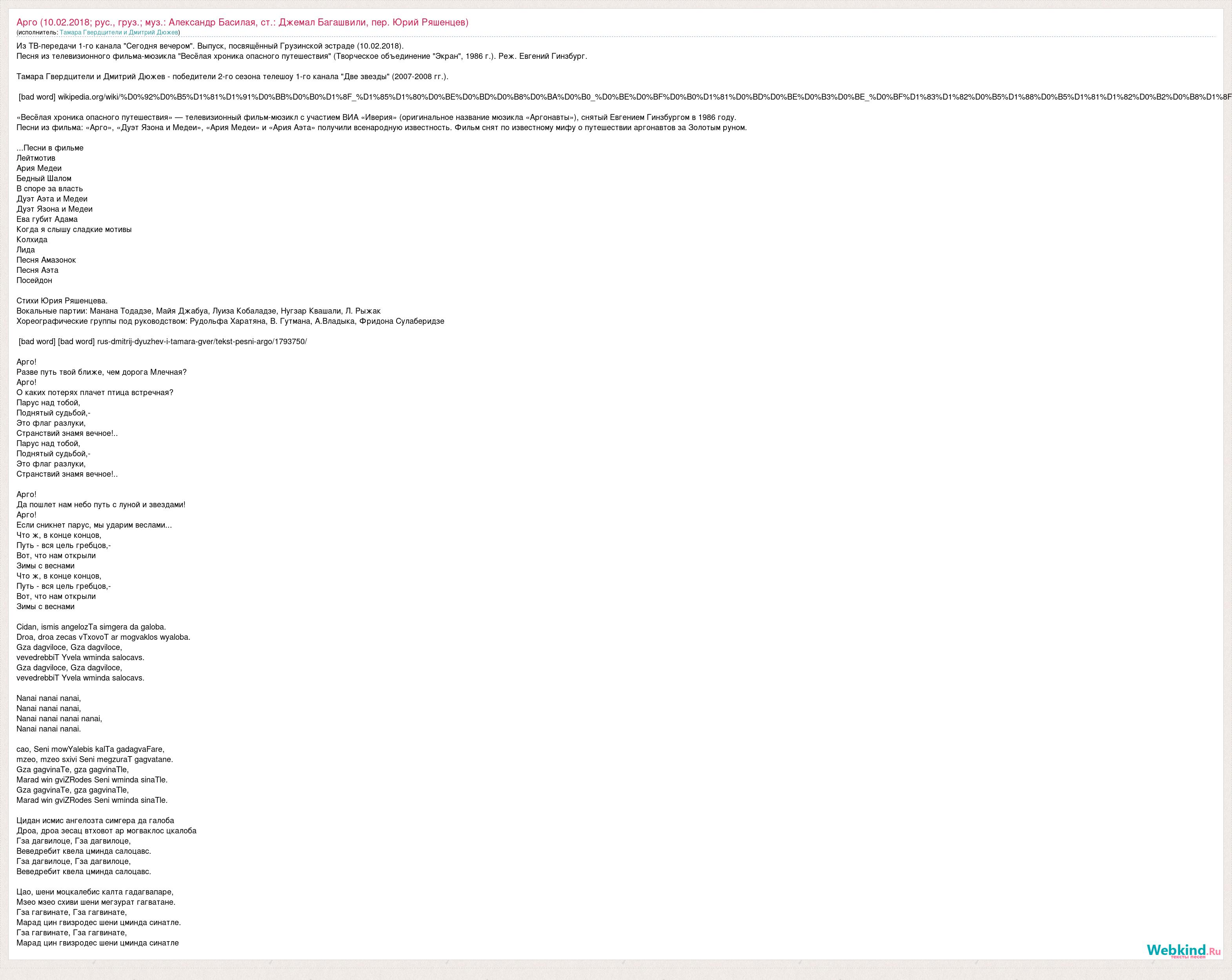 Из ТВ-передачи 1-го канала "Сегодня вечером". Выпуск, посвящённый Грузинской эстраде (10.02.2018). Песня из телевизионного фильма-мюзикла "Весёлая хроника опасного путешествия" (Творческое объединение "Экран", 1986 г.). Реж. Евгений Гинзбург. Тамара Гвердцители и Дмитрий Дюжев - победители 2-го сезона телешоу 1-го канала "Две звезды" (2007-2008 гг.). [bad word] wikipedia.org/wiki/%D0%92%D0%B5%D1%81%D1%91%D0%BB%D0%B0%D1%8F_%D1%85%D1%80%D0%BE%D0%BD%D0%B8%D0%BA%D0%B0_%D0%BE%D0%BF%D0%B0%D1%81%D0%BD%D0%BE%D0%B3%D0%BE_%D0%BF%D1%83%D1%82%D0%B5%D1%88%D0%B5%D1%81%D1%82%D0%B2%D0%B8%D1%8F «Весёлая хроника опасного путешествия» — телевизионный фильм-мюзикл с участием ВИА «Иверия» (оригинальное название мюзикла «Аргонавты»), снятый Евгением Гинзбургом в 1986 году. Песни из фильма: «Арго», «Дуэт Язона и Медеи», «Ария Медеи» и «Ария Аэта» получили всенародную известность. Фильм снят по известному мифу о путешествии аргонавтов за Золотым руном. ...Песни в фильме Лейтмотив Ария Медеи Бедный Шалом В споре за власть Дуэт Аэта и Медеи Дуэт Язона и Медеи Ева губит Адама Когда я слышу сладкие мотивы Колхида Лида Песня Амазонок Песня Аэта Посейдон Стихи Юрия Ряшенцева. Вокальные партии: Манана Тодадзе, Майя Джабуа, Луиза Кобаладзе, Нугзар Квашали, Л. Рыжак Хореографические группы под руководством: Рудольфа Харатяна, В. Гутмана, А.Владыка, Фридона Сулаберидзе [bad word] [bad word] rus-dmitrij-dyuzhev-i-tamara-gver/tekst-pesni-argo/1793750/ Арго! Разве путь твой ближе, чем дорога Млечная? Арго! О каких потерях плачет птица встречная? Парус над тобой, Поднятый судьбой,- Это флаг разлуки, Странствий знамя вечное!.. Парус над тобой, Поднятый судьбой,- Это флаг разлуки, Странствий знамя вечное!.. Арго! Да пошлет нам небо путь с луной и звездами! Арго! Если сникнет парус, мы ударим веслами... Что ж, в конце концов, Путь - вся цель гребцов,- Вот, что нам открыли Зимы с веснами Что ж, в конце концов, Путь - вся цель гребцов,- Вот, что нам открыли Зимы с веснами Cidan, ismis angelozTa simgera da galoba. Droa, droa zecas vTxovoT ar mogvaklos wyaloba. Gza dagviloce, Gza dagviloce, vevedrebbiT Yvela wminda salocavs. Gza dagviloce, Gza dagviloce, vevedrebbiT Yvela wminda salocavs. Nanai nanai nanai, Nanai nanai nanai, Nanai nanai nanai nanai, Nanai nanai nanai. cao, Seni mowYalebis kalTa gadagvaFare, mzeo, mzeo sxivi Seni megzuraT gagvatane. Gza gagvinaTe, gza gagvinaTle, Marad win gviZRodes Seni wminda sinaTle. Gza gagvinaTe, gza gagvinaTle, Marad win gviZRodes Seni wminda sinaTle. Цидан исмис ангелозта симгера да галоба Дроа, дроа зесац втховот ар могваклос цкалоба Гза дагвилоце, Гза дагвилоце, Веведребит квела цминда салоцавс. Гза дагвилоце, Гза дагвилоце, Веведребит квела цминда салоцавс. Цао, шени моцкалебис калта гадагвапаре, Мзео мзео схиви шени мегзурат гагватане. Гза гагвинате, Гза гагвинате, Марад цин гвизродес шени цминда синатле. Гза гагвинате, Гза гагвинате, Марад цин гвизродес шени цминда синатле