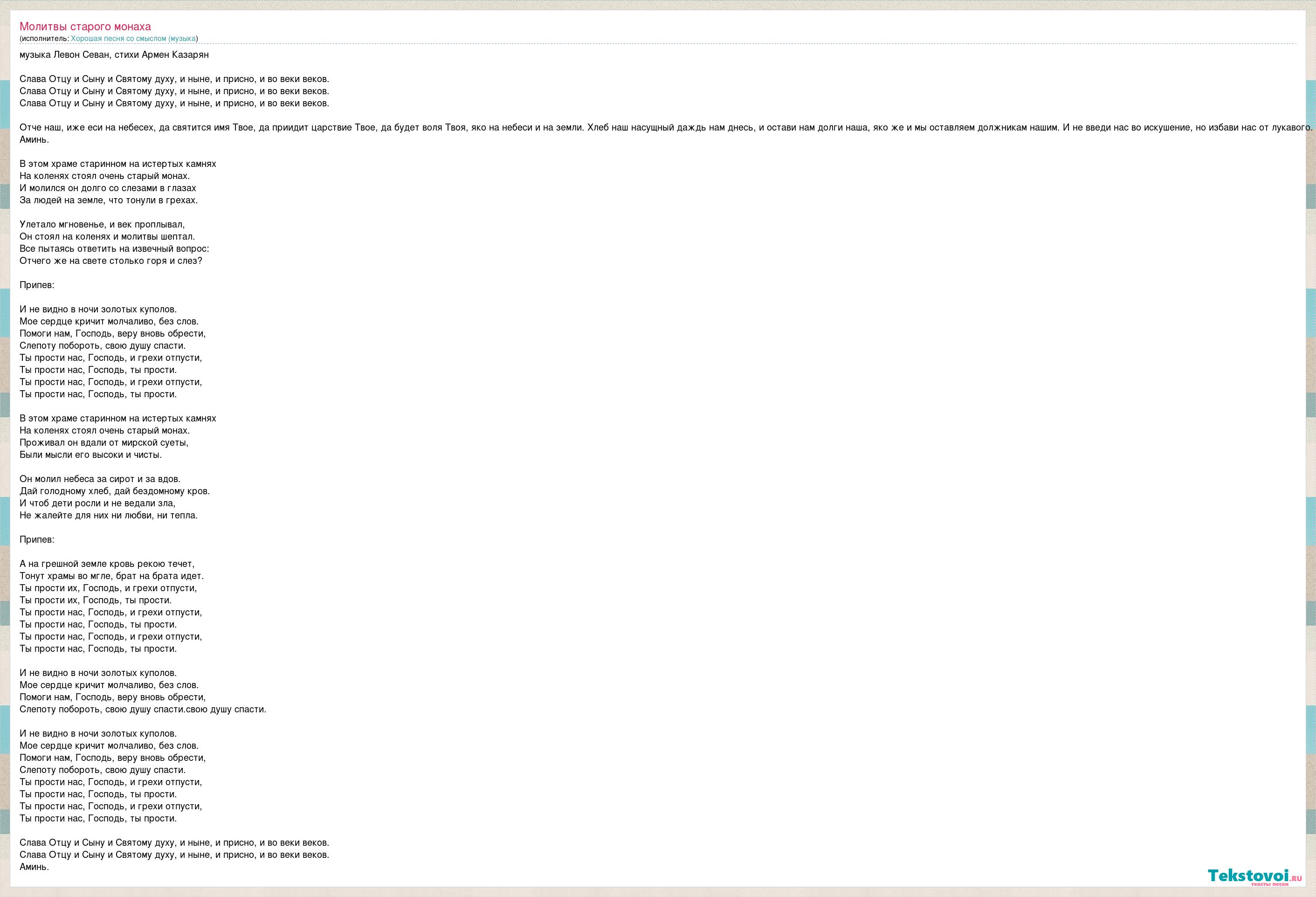 музыка Левон Севан, стихи Армен Казарян Слава Отцу и Сыну и Святому духу, и ныне, и присно, и во веки веков. Слава Отцу и Сыну и Святому духу, и ныне, и присно, и во веки веков. Слава Отцу и Сыну и Святому духу, и ныне, и присно, и во веки веков. Отче наш, иже еси на небесех, да святится имя Твое, да приидит царствие Твое, да будет воля Твоя, яко на небеси и на земли. Хлеб наш насущный даждь нам днесь, и остави нам долги наша, яко же и мы оставляем должникам нашим. И не введи нас во искушение, но избави нас от лукавого. Аминь. В этом храме старинном на истертых камнях На коленях стоял очень старый монах. И молился он долго со слезами в глазах За людей на земле, что тонули в грехах. Улетало мгновенье, и век проплывал, Он стоял на коленях и молитвы шептал. Все пытаясь ответить на извечный вопрос: Отчего же на свете столько горя и слез? Припев: И не видно в ночи золотых куполов. Мое сердце кричит молчаливо, без слов. Помоги нам, Господь, веру вновь обрести, Слепоту побороть, свою душу спасти. Ты прости нас, Господь, и грехи отпусти, Ты прости нас, Господь, ты прости. Ты прости нас, Господь, и грехи отпусти, Ты прости нас, Господь, ты прости. В этом храме старинном на истертых камнях На коленях стоял очень старый монах. Проживал он вдали от мирской суеты, Были мысли его высоки и чисты. Он молил небеса за сирот и за вдов. Дай голодному хлеб, дай бездомному кров. И чтоб дети росли и не ведали зла, Не жалейте для них ни любви, ни тепла. Припев: А на грешной земле кровь рекою течет, Тонут храмы во мгле, брат на брата идет. Ты прости их, Господь, и грехи отпусти, Ты прости их, Господь, ты прости. Ты прости нас, Господь, и грехи отпусти, Ты прости нас, Господь, ты прости. Ты прости нас, Господь, и грехи отпусти, Ты прости нас, Господь, ты прости. И не видно в ночи золотых куполов. Мое сердце кричит молчаливо, без слов. Помоги нам, Господь, веру вновь обрести, Слепоту побороть, свою душу спасти.свою душу спасти. И не видно в ночи золотых куполов. Мое сердце кричит молчаливо, без слов. Помоги нам, Господь, веру вновь обрести, Слепоту побороть, свою душу спасти. Ты прости нас, Господь, и грехи отпусти, Ты прости нас, Господь, ты прости. Ты прости нас, Господь, и грехи отпусти, Ты прости нас, Господь, ты прости. Слава Отцу и Сыну и Святому духу, и ныне, и присно, и во веки веков. Слава Отцу и Сыну и Святому духу, и ныне, и присно, и во веки веков. Аминь.