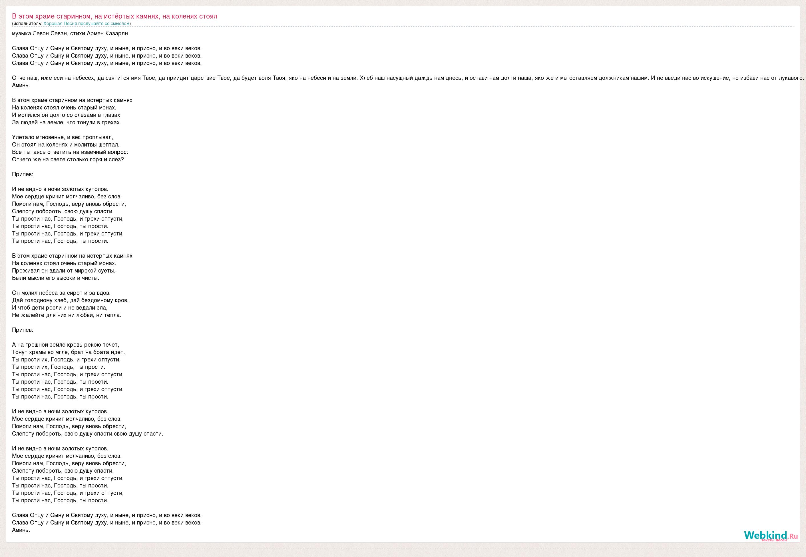 музыка Левон Севан, стихи Армен Казарян Слава Отцу и Сыну и Святому духу, и ныне, и присно, и во веки веков. Слава Отцу и Сыну и Святому духу, и ныне, и присно, и во веки веков. Слава Отцу и Сыну и Святому духу, и ныне, и присно, и во веки веков. Отче наш, иже еси на небесех, да святится имя Твое, да приидит царствие Твое, да будет воля Твоя, яко на небеси и на земли. Хлеб наш насущный даждь нам днесь, и остави нам долги наша, яко же и мы оставляем должникам нашим. И не введи нас во искушение, но избави нас от лукавого. Аминь. В этом храме старинном на истертых камнях На коленях стоял очень старый монах. И молился он долго со слезами в глазах За людей на земле, что тонули в грехах. Улетало мгновенье, и век проплывал, Он стоял на коленях и молитвы шептал. Все пытаясь ответить на извечный вопрос: Отчего же на свете столько горя и слез? Припев: И не видно в ночи золотых куполов. Мое сердце кричит молчаливо, без слов. Помоги нам, Господь, веру вновь обрести, Слепоту побороть, свою душу спасти. Ты прости нас, Господь, и грехи отпусти, Ты прости нас, Господь, ты прости. Ты прости нас, Господь, и грехи отпусти, Ты прости нас, Господь, ты прости. В этом храме старинном на истертых камнях На коленях стоял очень старый монах. Проживал он вдали от мирской суеты, Были мысли его высоки и чисты. Он молил небеса за сирот и за вдов. Дай голодному хлеб, дай бездомному кров. И чтоб дети росли и не ведали зла, Не жалейте для них ни любви, ни тепла. Припев: А на грешной земле кровь рекою течет, Тонут храмы во мгле, брат на брата идет. Ты прости их, Господь, и грехи отпусти, Ты прости их, Господь, ты прости. Ты прости нас, Господь, и грехи отпусти, Ты прости нас, Господь, ты прости. Ты прости нас, Господь, и грехи отпусти, Ты прости нас, Господь, ты прости. И не видно в ночи золотых куполов. Мое сердце кричит молчаливо, без слов. Помоги нам, Господь, веру вновь обрести, Слепоту побороть, свою душу спасти.свою душу спасти. И не видно в ночи золотых куполов. Мое сердце кричит молчаливо, без слов. Помоги нам, Господь, веру вновь обрести, Слепоту побороть, свою душу спасти. Ты прости нас, Господь, и грехи отпусти, Ты прости нас, Господь, ты прости. Ты прости нас, Господь, и грехи отпусти, Ты прости нас, Господь, ты прости. Слава Отцу и Сыну и Святому духу, и ныне, и присно, и во веки веков. Слава Отцу и Сыну и Святому духу, и ныне, и присно, и во веки веков. Аминь.