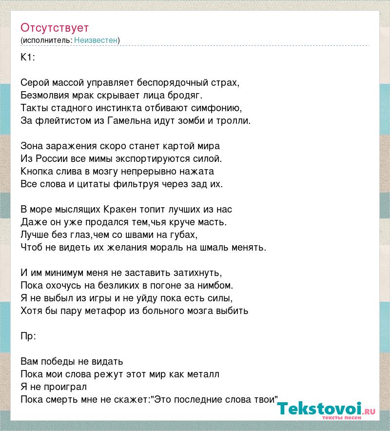 К1: Серой массой управляет беспорядочный страх, Безмолвия мрак скрывает лица бродяг. Такты стадного инстинкта отбивают симфонию, За флейтистом из Гамельна идут зомби и тролли. Зона заражения скоро станет картой мира Из России все мимы экспортируются силой. Кнопка слива в мозгу непрерывно нажата Все слова и цитаты фильтруя через зад их. В море мыслящих Кракен топит лучших из нас Даже он уже продался тем,чья круче масть. Лучше без глаз,чем со швами на губах, Чтоб не видеть их желания мораль на шмаль менять. И им минимум меня не заставить затихнуть, Пока охочусь на безликих в погоне за нимбом. Я не выбыл из игры и не уйду пока есть силы, Хотя бы пару метафор из больного мозга выбить Пр: Вам победы не видать Пока мои слова режут этот мир как металл Я не проиграл Пока смерть мне не скажет:"Это последние слова твои"
