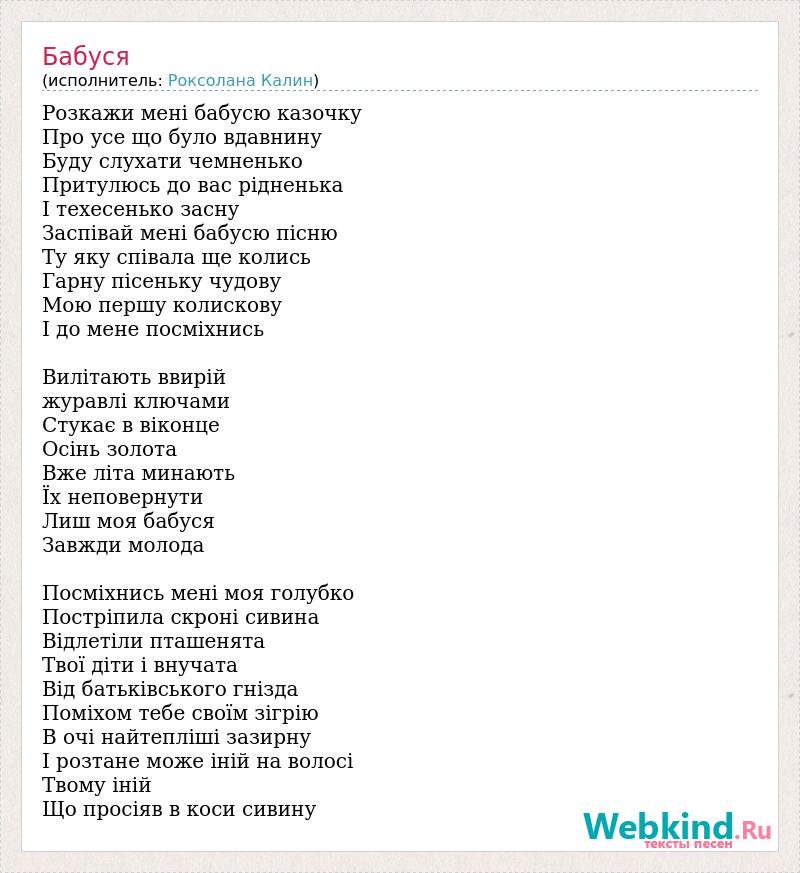 Розкажи мені бабусю казочку Про усе що було вдавнину Буду слухати чемненько Притулюсь до вас рідненька І техесенько засну Заспівай мені бабусю пісню Ту яку співала ще колись Гарну пісеньку чудову Мою першу колискову І до мене посміхнись Вилітають ввирій журавлі ключами Стукає в віконце Осінь золота Вже літа минають Їх неповернути Лиш моя бабуся Завжди молода Посміхнись мені моя голубко Постріпила скроні сивина Відлетіли пташенята Твої діти і внучата Від батьківського гнізда Поміхом тебе своїм зігрію В очі найтепліші зазирну І розтане може іній на волосі Твому іній Що просіяв в коси сивину