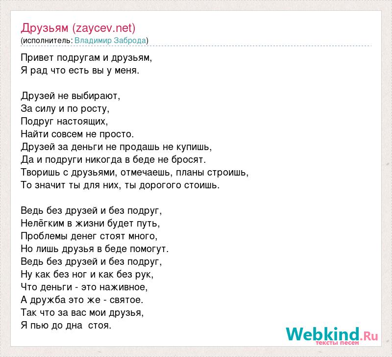 Привет подругам и друзьям, Я рад что есть вы у меня. Друзей не выбирают, За силу и по росту, Подруг настоящих, Найти совсем не просто. Друзей за деньги не продашь не купишь, Да и подруги никогда в беде не бросят. Творишь с друзьями, отмечаешь, планы строишь, То значит ты для них, ты дорогого стоишь. Ведь без друзей и без подруг, Нелёгким в жизни будет путь, Проблемы денег стоят много, Но лишь друзья в беде помогут. Ведь без друзей и без подруг, Ну как без ног и как без рук, Что деньги - это наживное, А дружба это же - святое. Так что за вас мои друзья, Я пью до дна стоя.