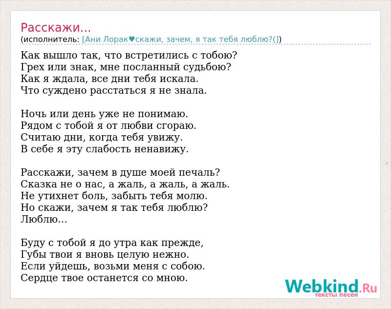 Как вышло так, что встретились с тобою? Грех или знак, мне посланный судьбою? Как я ждала, все дни тебя искала. Что суждено расстаться я не знала. Ночь или день уже не понимаю. Рядом с тобой я от любви сгораю. Считаю дни, когда тебя увижу. В себе я эту слабость ненавижу. Расскажи, зачем в душе моей печаль? Сказка не о нас, а жаль, а жаль, а жаль. Не утихнет боль, забыть тебя молю. Но скажи, зачем я так тебя люблю? Люблю… Буду с тобой я до утра как прежде, Губы твои я вновь целую нежно. Если уйдешь, возьми меня с собою. Сердце твое останется со мною.
