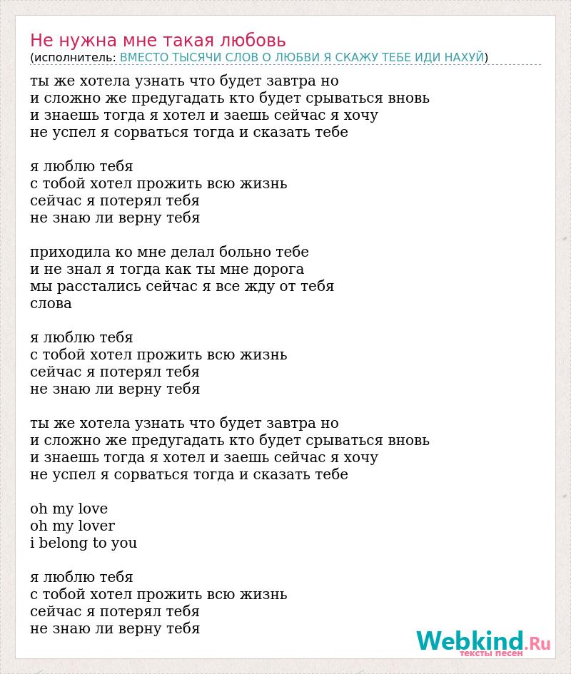 ты же хотела узнать что будет завтра но и сложно же предугадать кто будет срываться вновь и знаешь тогда я хотел и заешь сейчас я хочу не успел я сорваться тогда и сказать тебе я люблю тебя с тобой хотел прожить всю жизнь сейчас я потерял тебя не знаю ли верну тебя приходила ко мне делал больно тебе и не знал я тогда как ты мне дорога мы расстались сейчас я все жду от тебя слова я люблю тебя с тобой хотел прожить всю жизнь сейчас я потерял тебя не знаю ли верну тебя ты же хотела узнать что будет завтра но и сложно же предугадать кто будет срываться вновь и знаешь тогда я хотел и заешь сейчас я хочу не успел я сорваться тогда и сказать тебе oh my love oh my lover i belong to you я люблю тебя с тобой хотел прожить всю жизнь сейчас я потерял тебя не знаю ли верну тебя